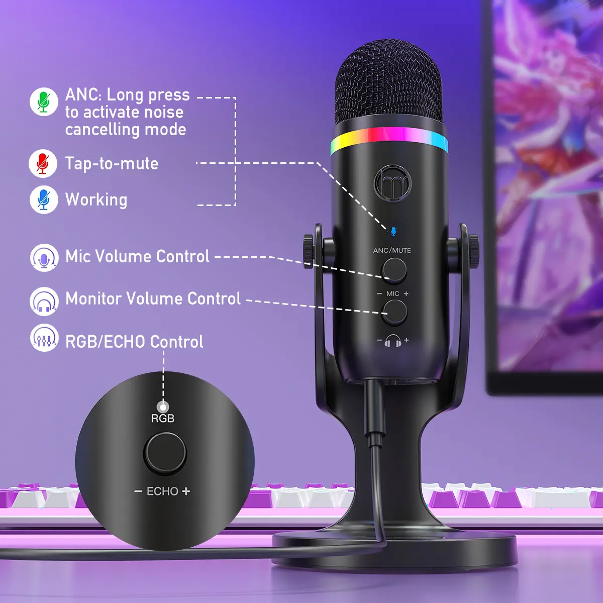 This K66 RGB microphone delivers sharp, distortion-free sound with a cardioid pickup pattern and active noise cancellation. Simply hold the mute button until the LED turns green to activate noise cancel mode, making it perfect for gaming, streaming, podcasting, ASMR, and professional recordings.