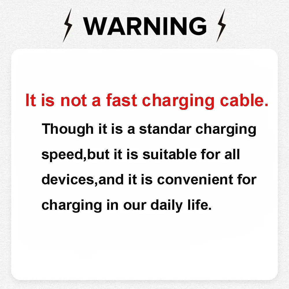 NOTE:This is not a fast charging cable,though it has a standard charging speed,but it suitable for all devices,and it is convenient in our daily life.