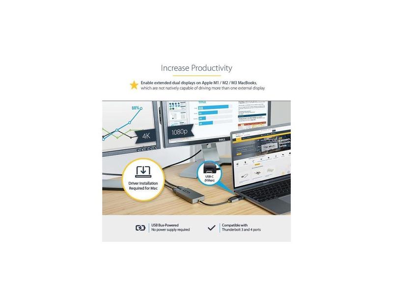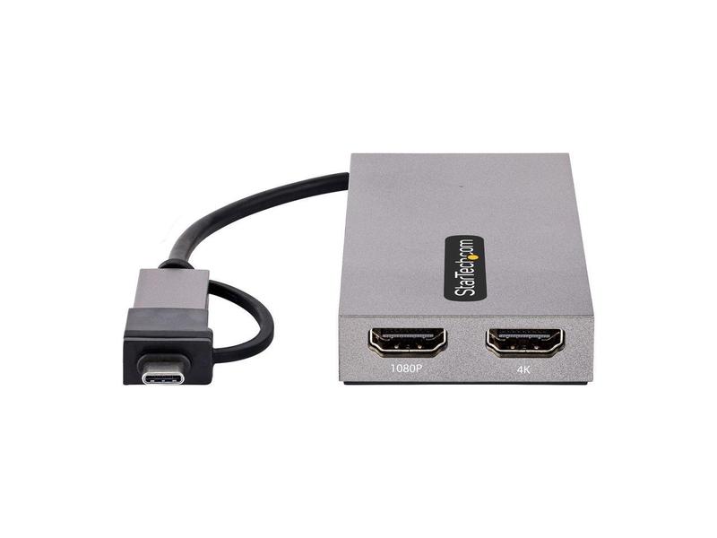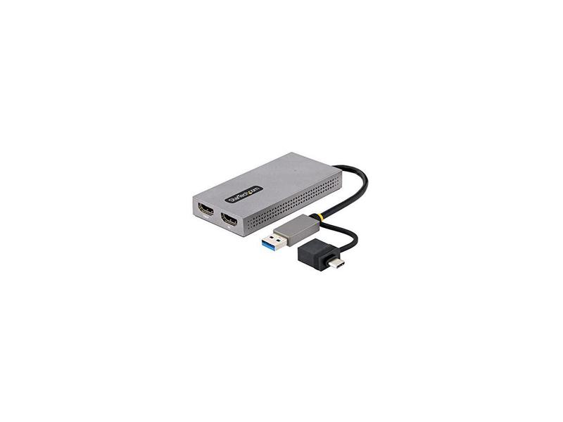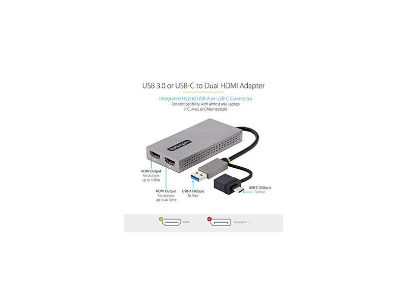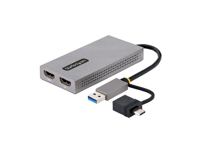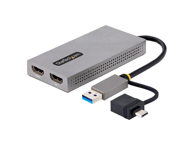 ·This USB to Dual HDMI® Adapter enables the addition of two independent HDMI displays (1x 4K & 1x 1080p) to your computer, using a single USB Type-A 3.2 Gen 1 (5 Gbps) connection.Increase Productivity with Multiple DisplaysThis USB to HDMI Dual Monitor Adapter features two video outputs, boosting productivity by connecting up to two displays using a single USB Type-A or C port. The adapter is bus-powered, lightweight, and features an integrated 4.3" (11cm) USB cable, making it ideal for transitioning between the office, home, or connecting to displays in a boardroom.4K ResolutionConnect a 4K 30Hz and a 1080p display to a laptop or desktop. The USB to Multi-Monitor Adapter supports extended or mirrored display modes, and ultrawide displays, providing additional viewing space.Wide-Ranging System CompatibilityThe USB video adapter is compatible with Windows, macOS, and Chrome OS. The integrated USB-A to USB-C dongle ensures USB compatibility with any host running a supported operating system. The attached 4.3in (11cm) cable is convenient for on the go use.107B-USB-HDMI is backed for 3-years by StarTech.com, including free 24/5 multi-lingual technical assistance.More from the Manufacturer