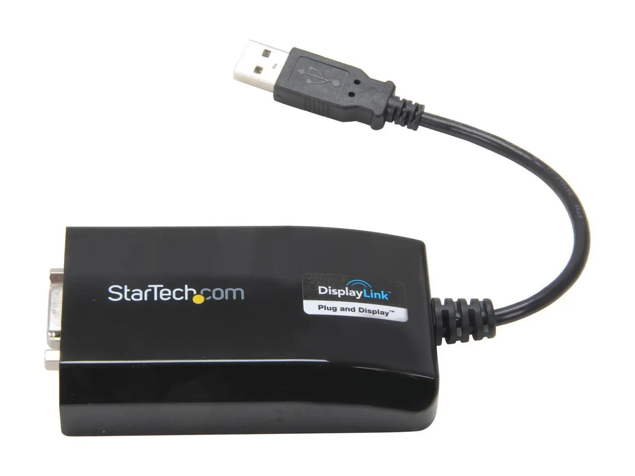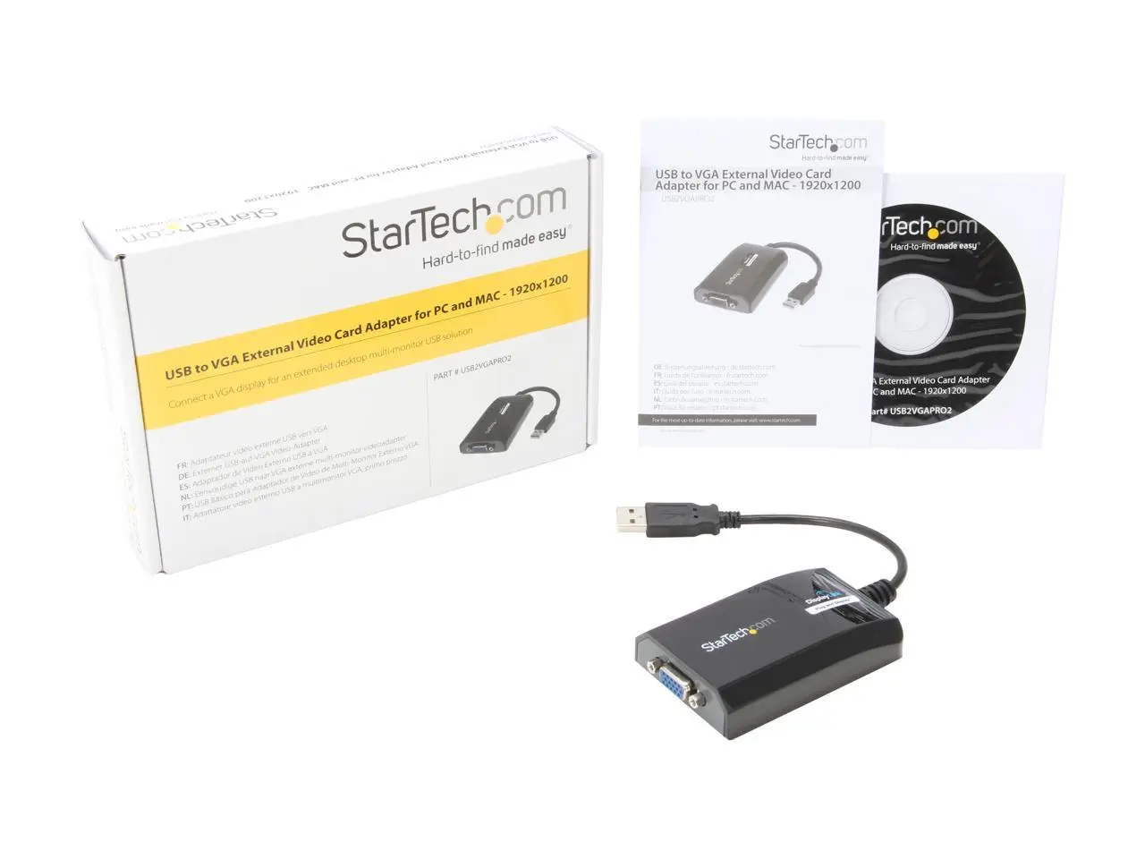 Ever wish you could add an extra monitor without hassle? This USB to VGA adapter from StarTech.com makes it a breeze. Whether you're on a PC or Mac, just plug it in via USB and connect your VGA display for an extended desktop experience. With support for sharp 1920x1200 resolution, your visuals stay crisp and clear, perfect for work or entertainment. It acts like an external USB video graphics card, giving you extra screen real estate without opening up your computer. The sleek black design fits right in with your existing gear. Inside the box, you get the adapter ready to connect. Upgrade your setup and multitask like a pro—grab this handy display adapter today!