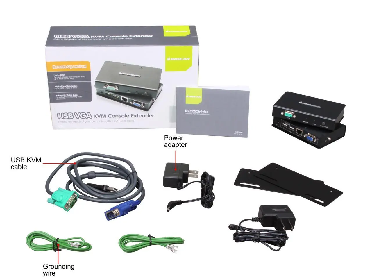 USB KVM Console Extender USB, VGA over Cat 5 cable The IOGEAR USB VGA KVM Console Extender allows access to a PC with USB or USB KVM switch from a remote USB VGA console (VGA monitor, USB keyboard, and USB mouse) via CAT5e/6 cable up to 500 feet away.
