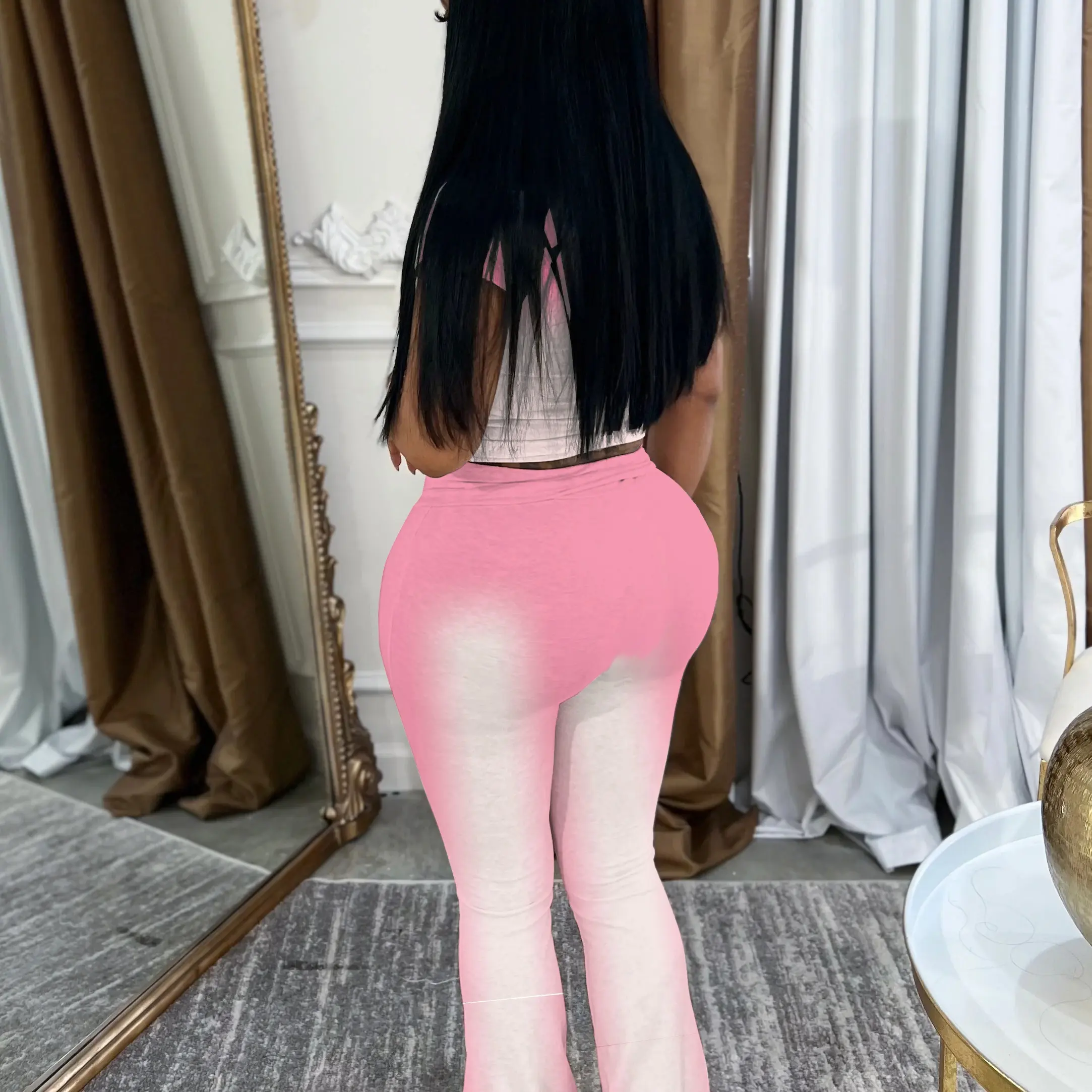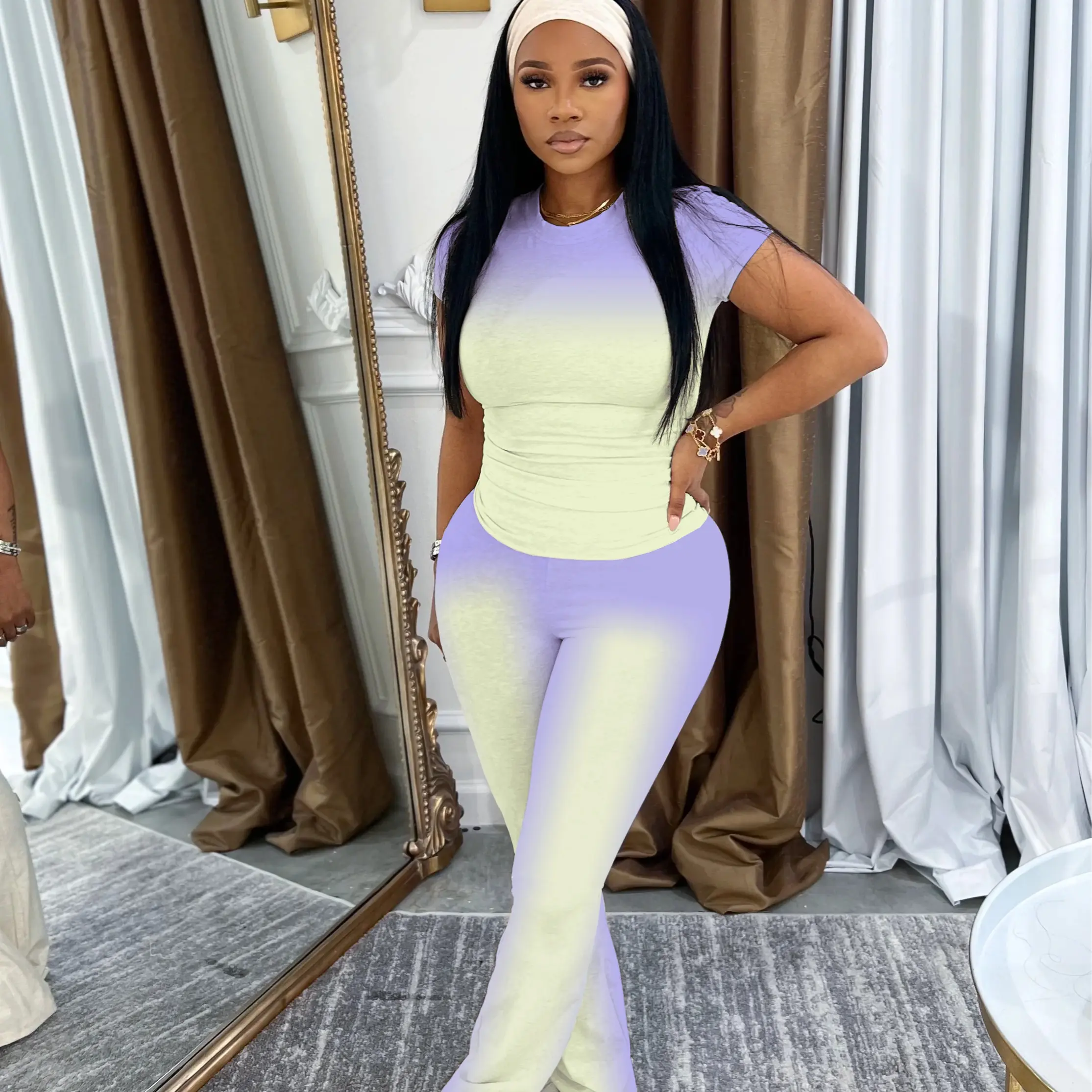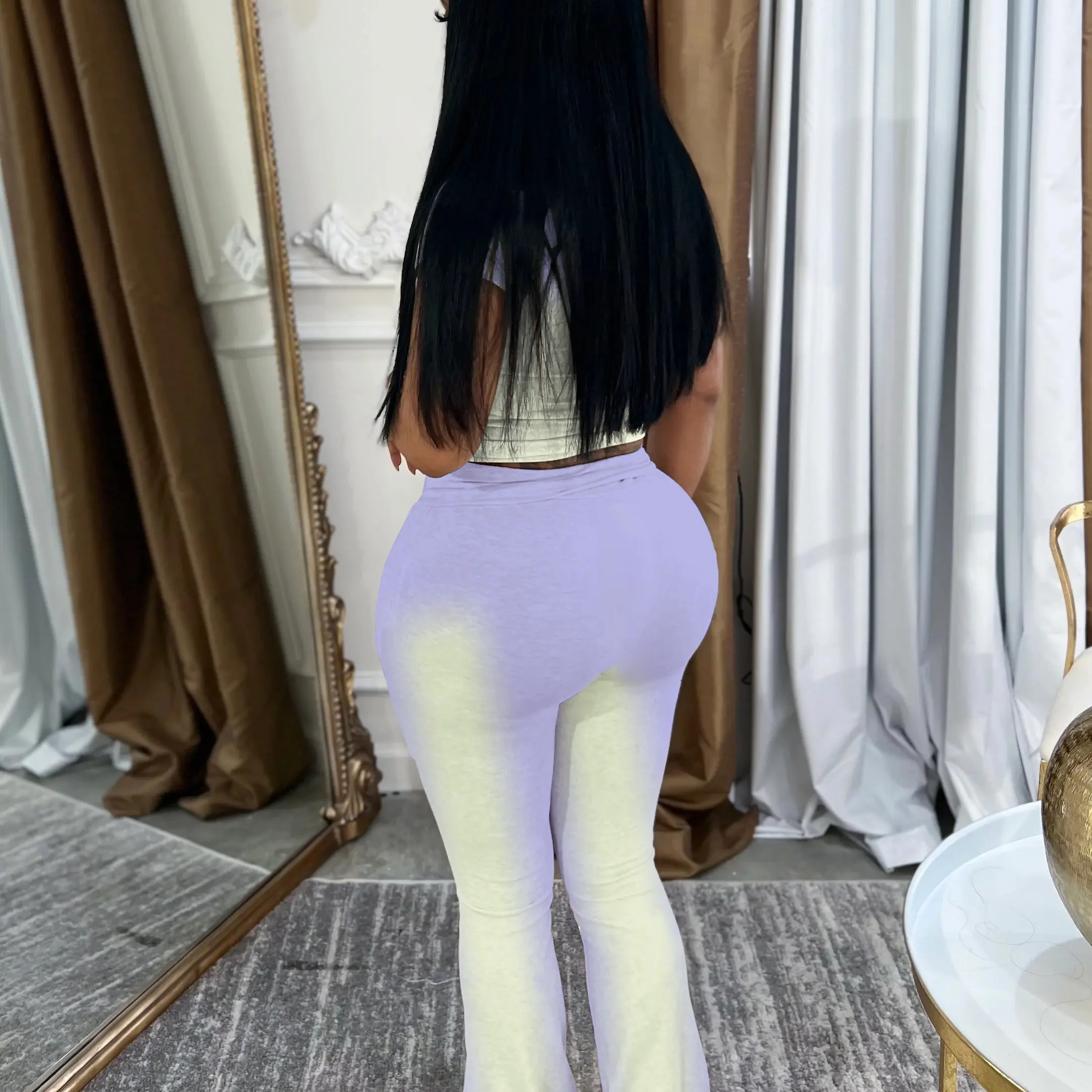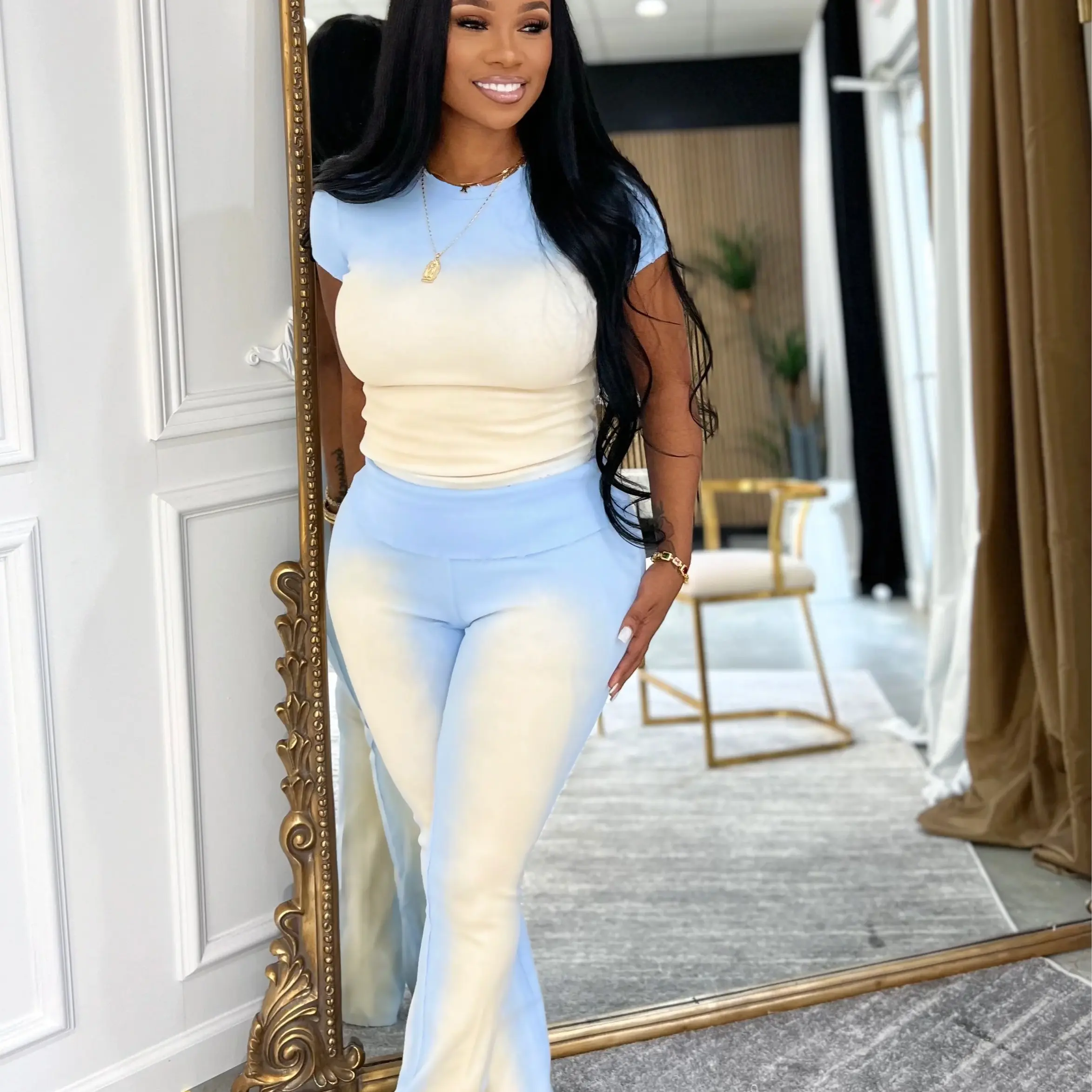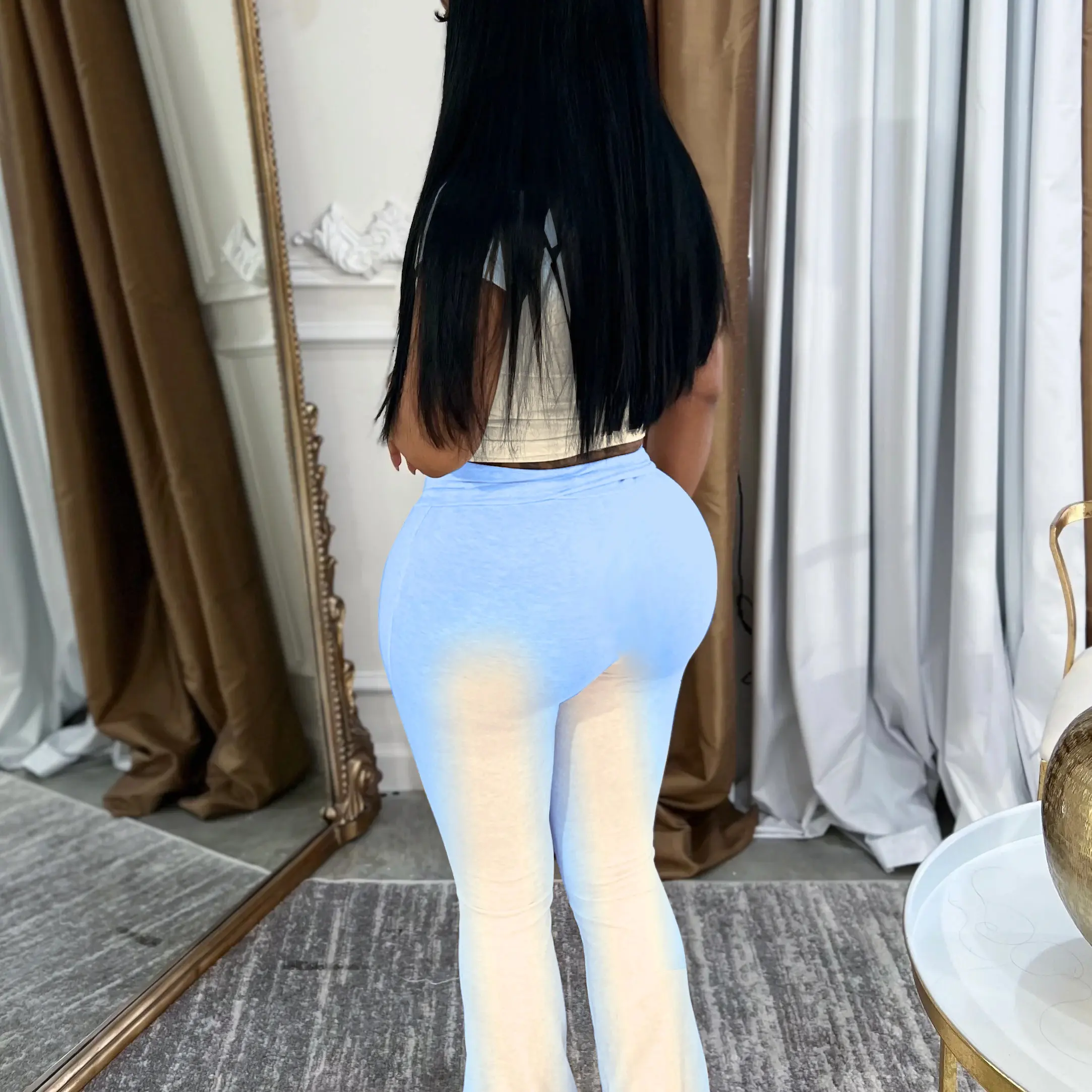 I will not recommend anyone to order this fit it's not what the photo is I received mines today and the pants is high waisted and the legs dragging the floor you have to be about 6'1 to wear this outfit I'm throwing it in the trash looks can be deceiving