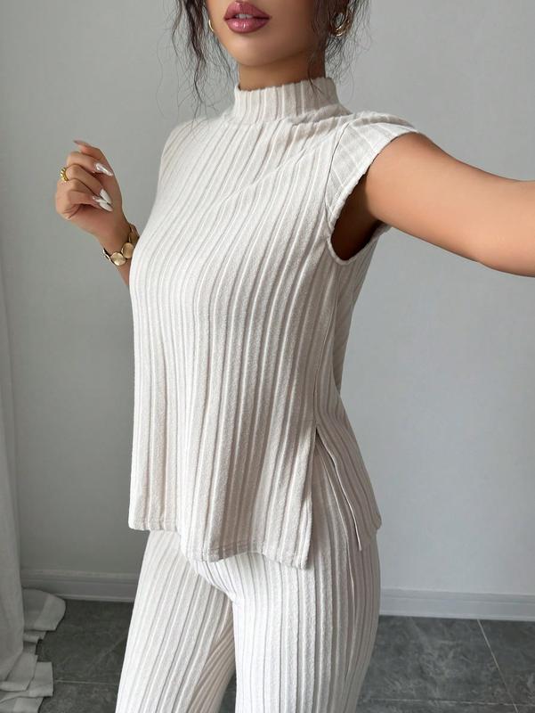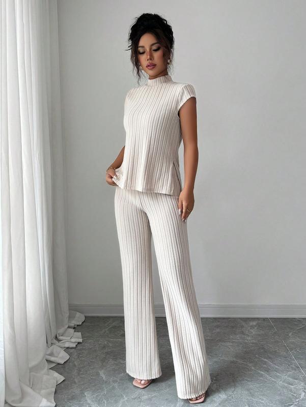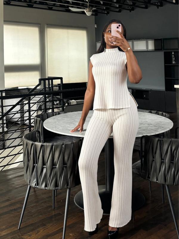 Embrace a blend of comfort and chic style with our spring-summer two-piece set. This matching ensemble features a ribbed knit short-sleeve top and flare trousers, crafted from a soft, stretchy blend. Perfect for casual outings, brunch dates, or stylish lounging, this set offers a polished look without compromising on comfort. Available in ten versatile colors.
