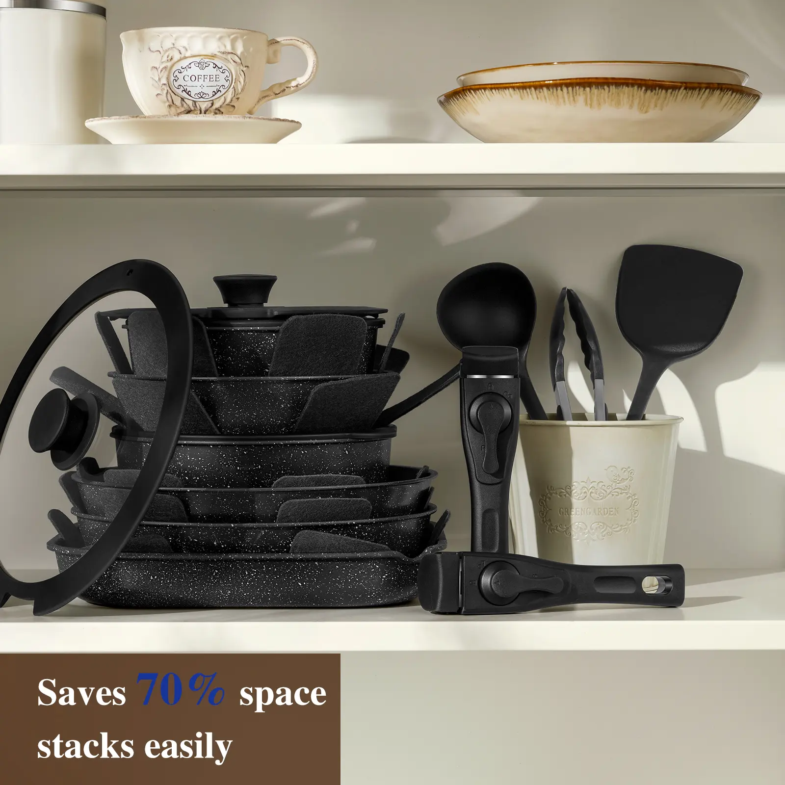 USELUCK 20 Pcs non stick pots and pans, Oven Safe, Stackable pots and pans with removable handles, Healthy RV Set with Detachable Handle Frying Induction Lids Stove Square Silicone Glass Cookware home use