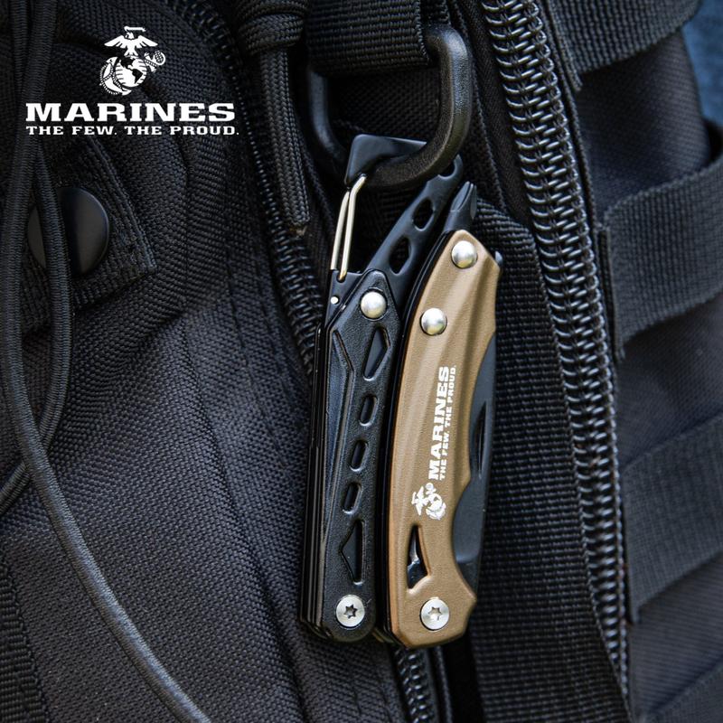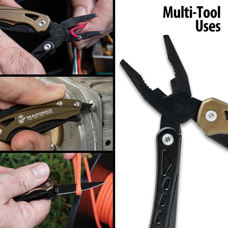 OFFICIALLY LICENSED: Features USMC branding and is built to meet the reliability standards expected by Marines.ALL-IN-ONE FUNCTIONALITY: Includes a stainless steel blade, saw, bottle opener, and Phillips head screwdriver.FOLD-OUT PLIERS: Opens into a dependable pair of pliers for gripping and tightening on the go.COMPACT DESIGN: Measures 3 1/4” closed and 4 1/2” open—small enough for pocket carry, big enough to get the job done.LIGHTWEIGHT HANDLE: Black and desert tan aluminum handle offers durable control without the bulk.