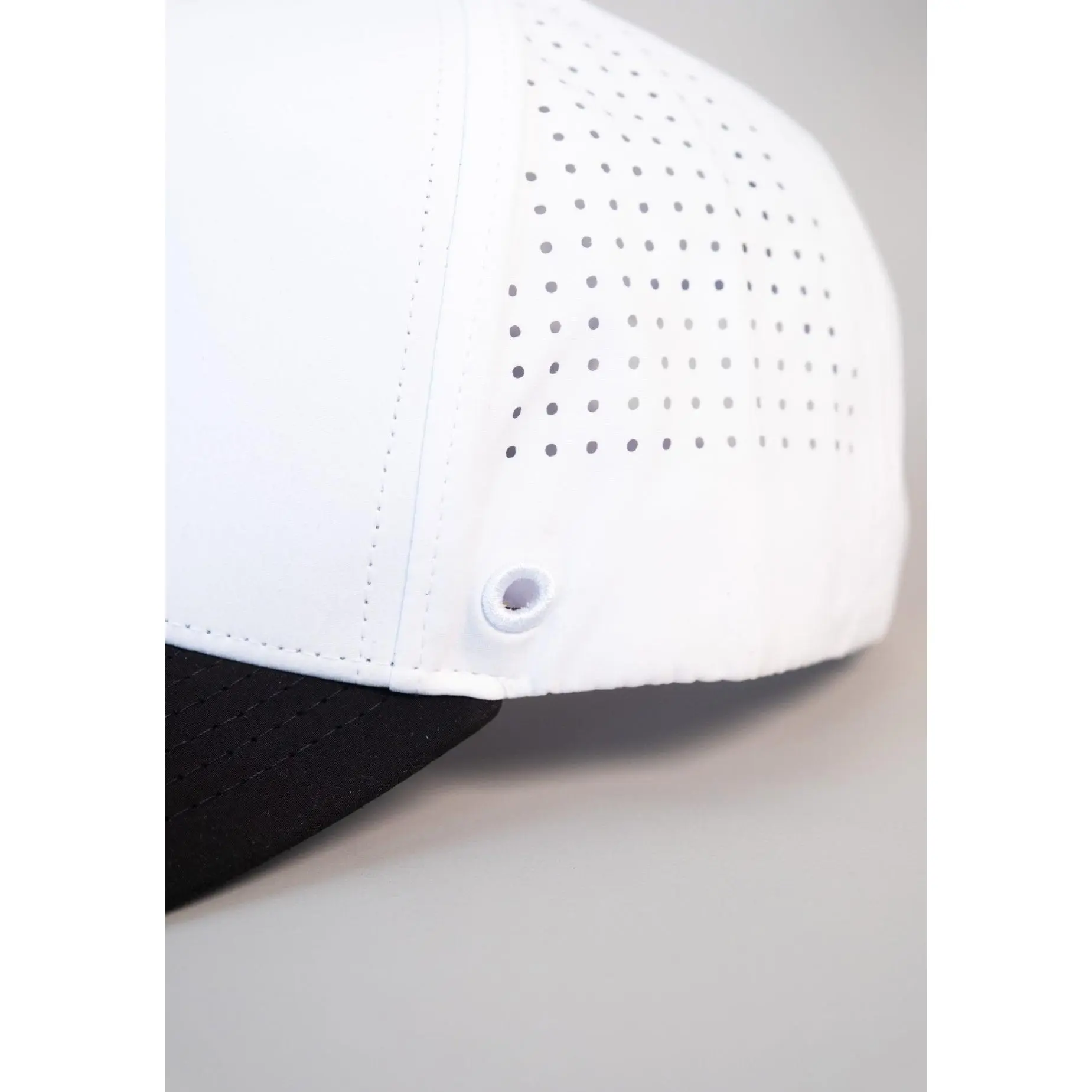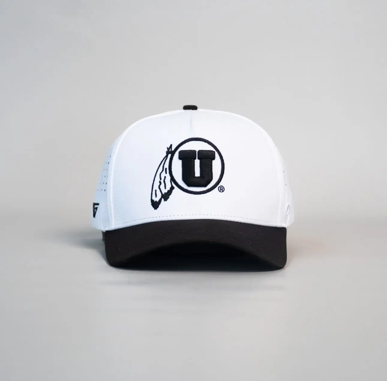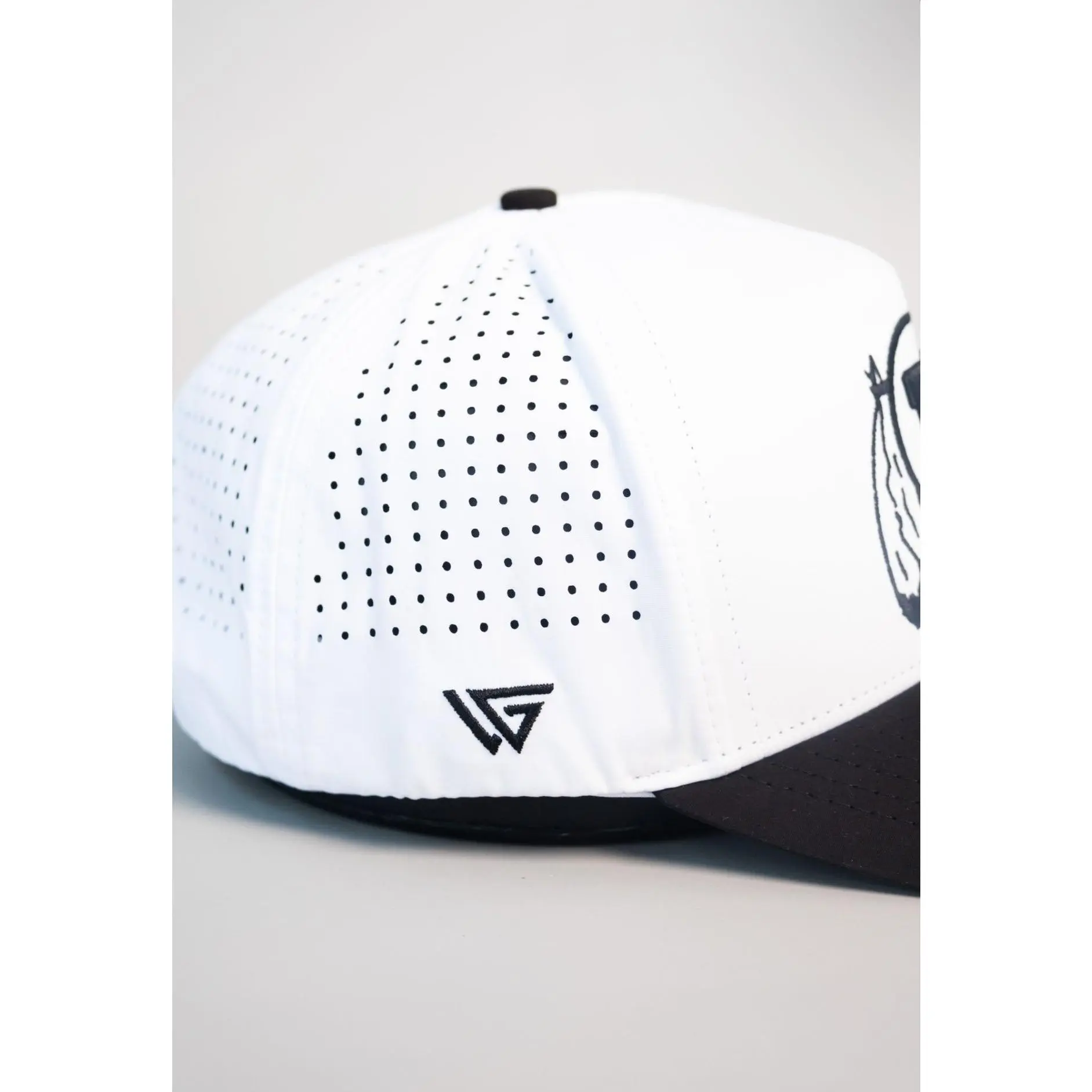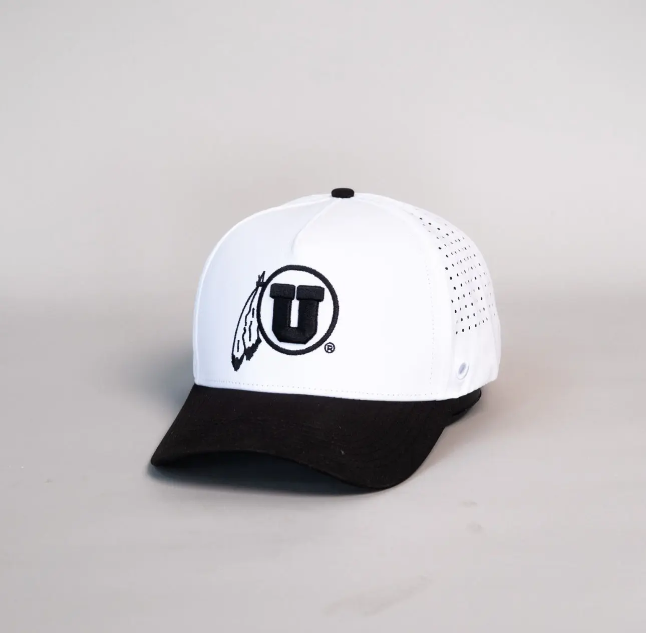 The Performance Drum and Feather Hat features a white crown with blacked-out drum and feather logo, a black performance brim, and laser-cut panels for max breathability.