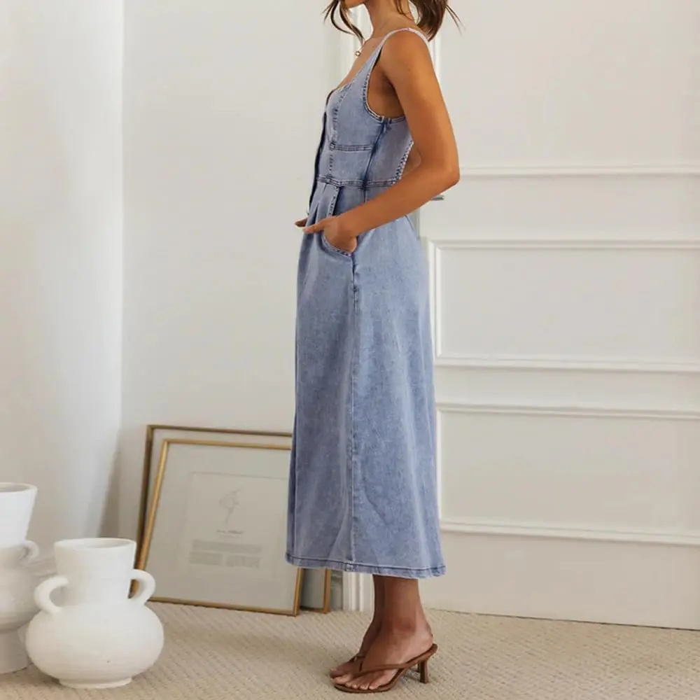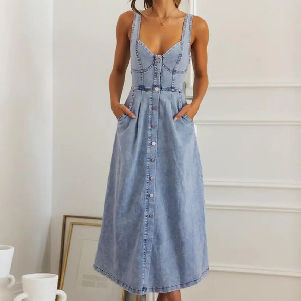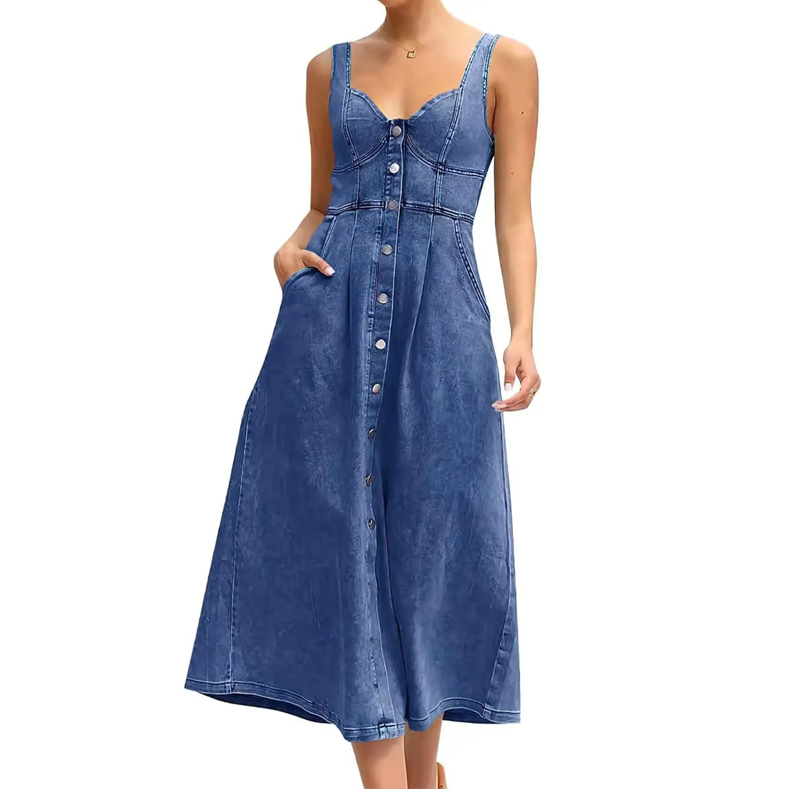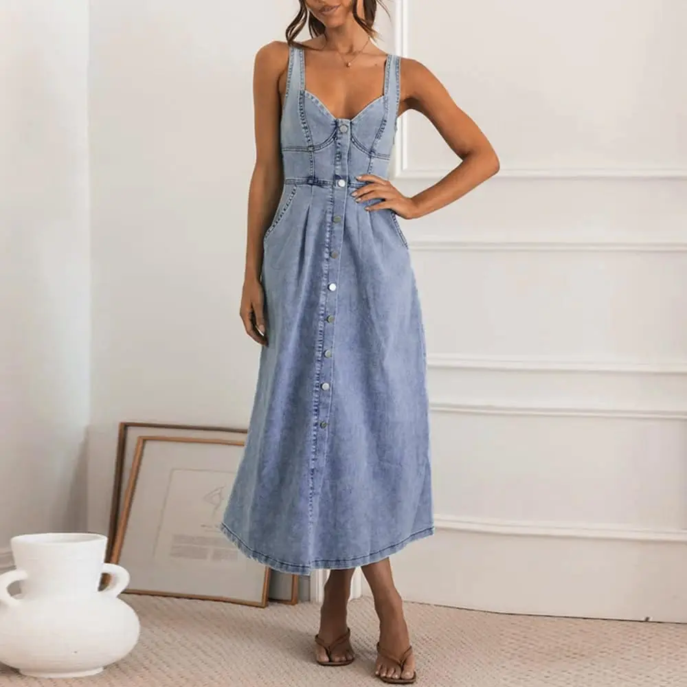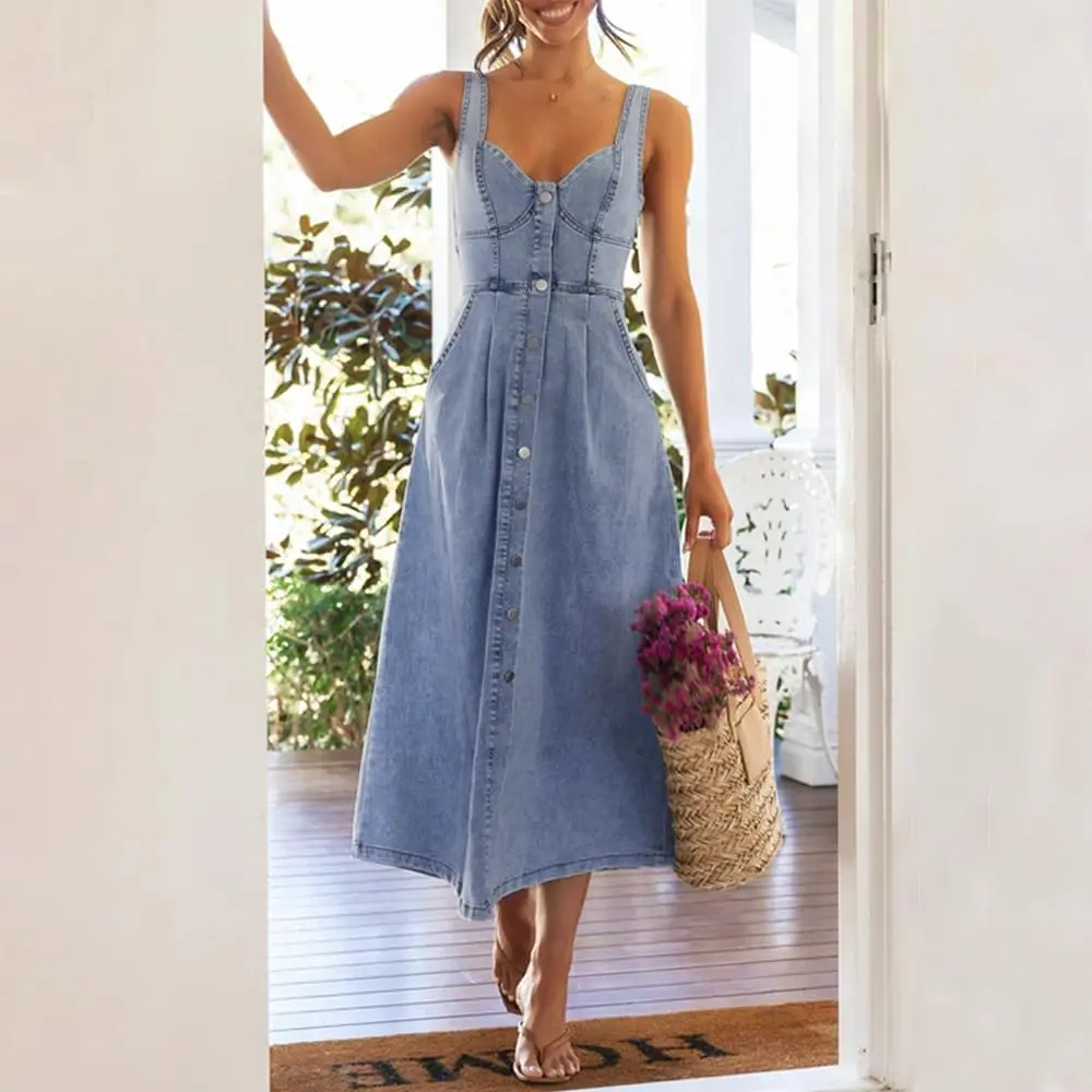 Timeless denim midi dress with a flattering slim fit, button-down front, and sleeveless design. This casual jean dress is perfect for summer outfits, brunch dates, vacations, or everyday wear—easy to style up or down for effortless chic. #DenimDress #JeanDress #MidiDress #springdress #casualchic