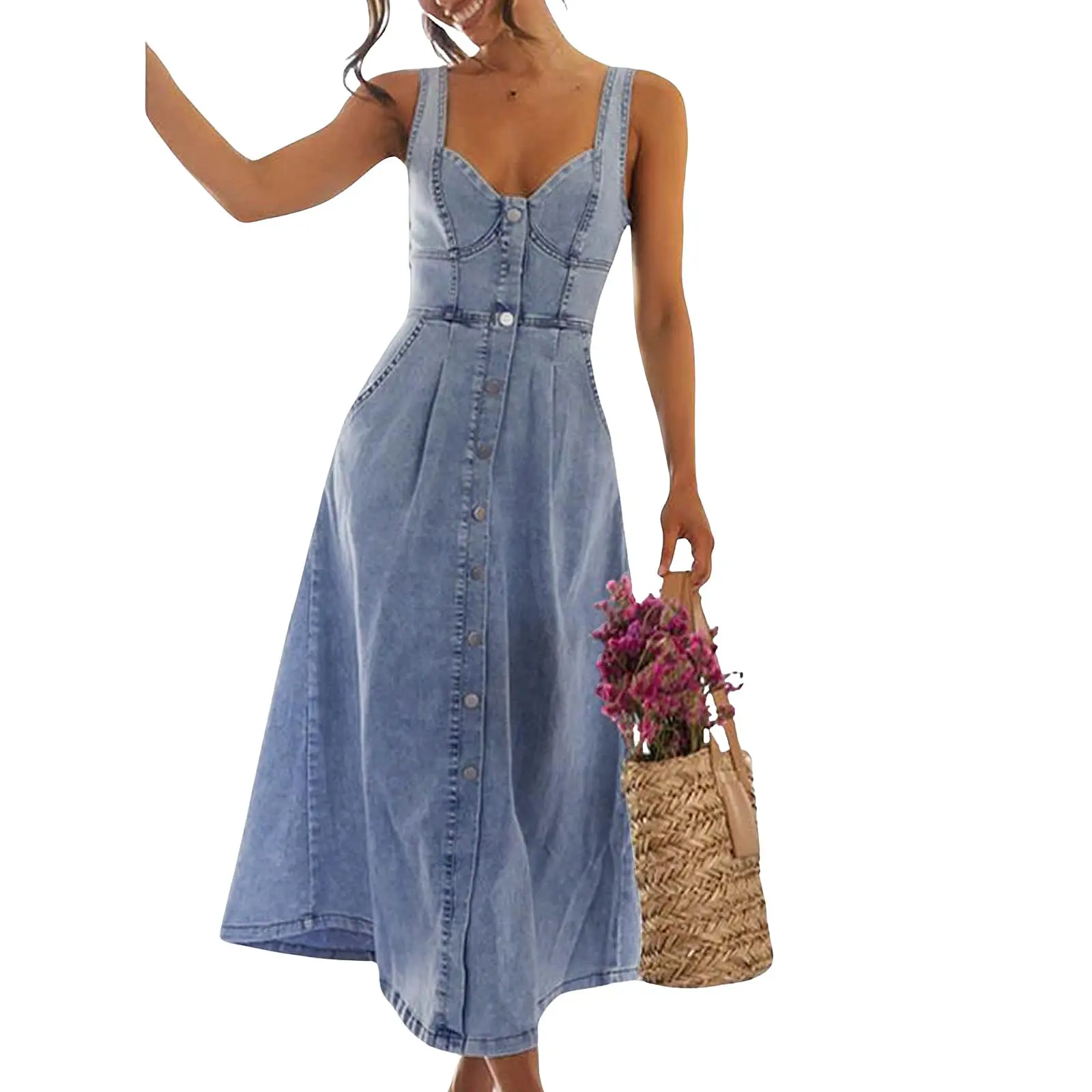 utcoco Denim Dress for Women Sleeveless Button Down Slim Fit Midi Jean Dresses for Women 2026 SpringStatements