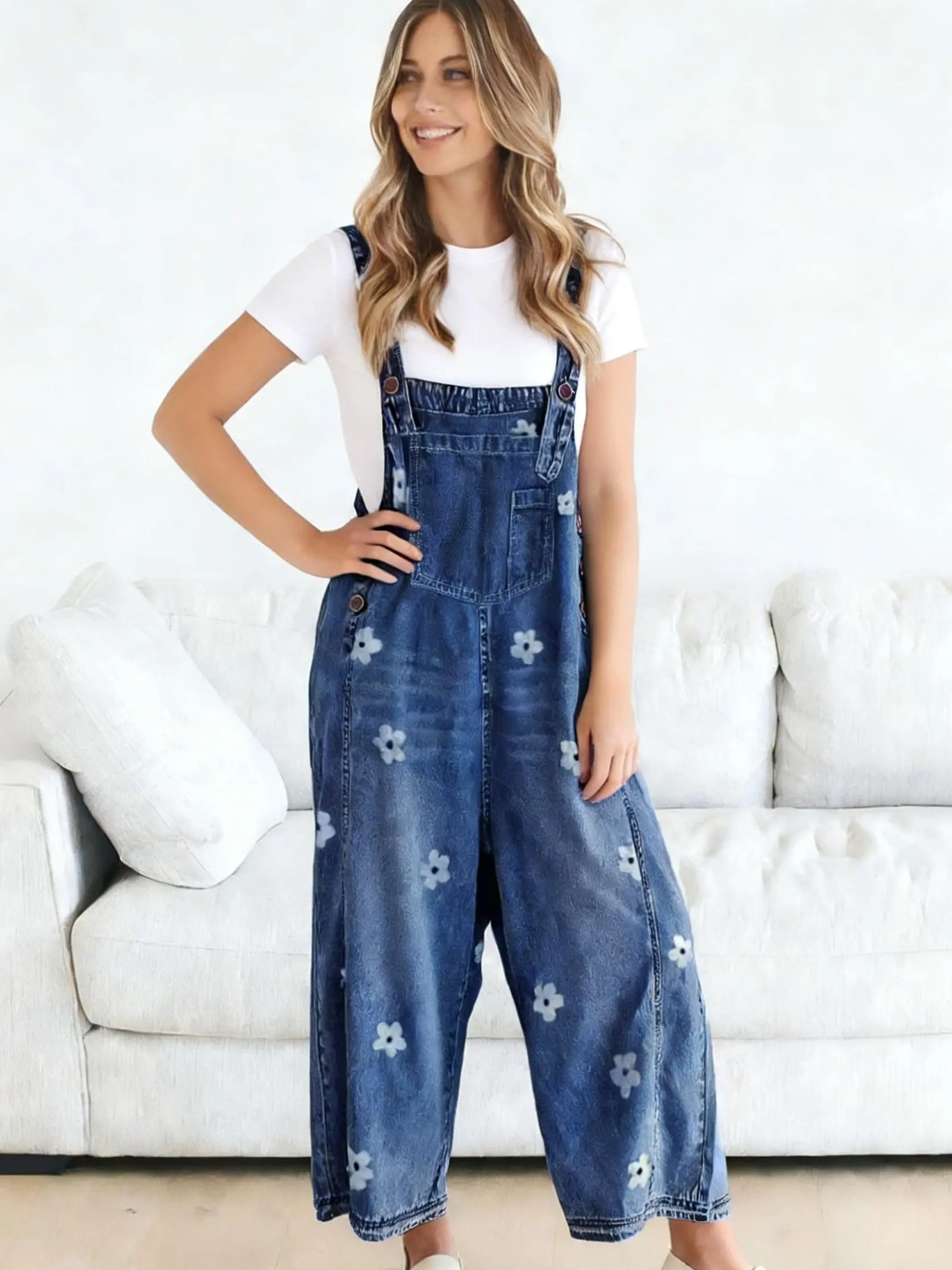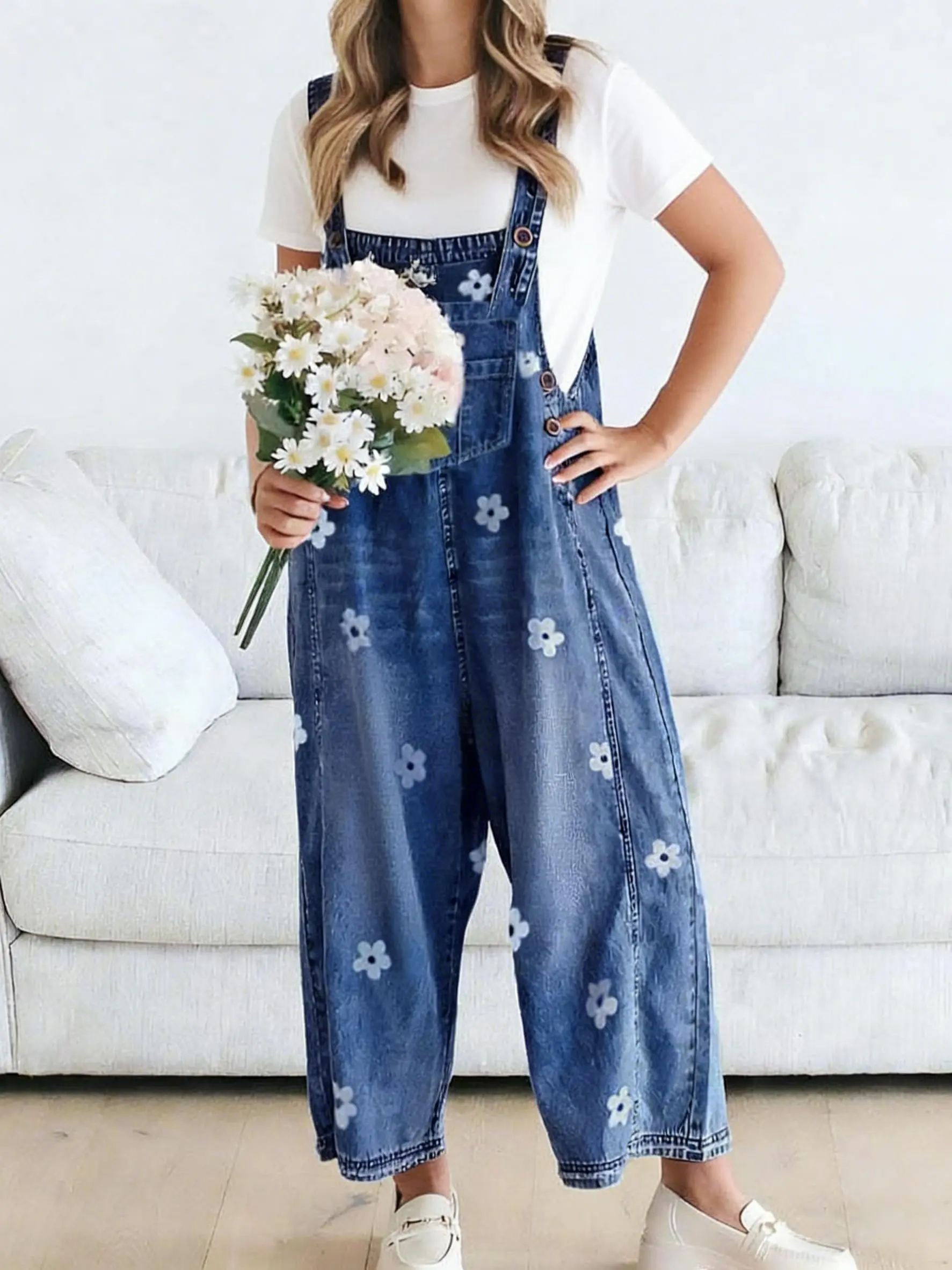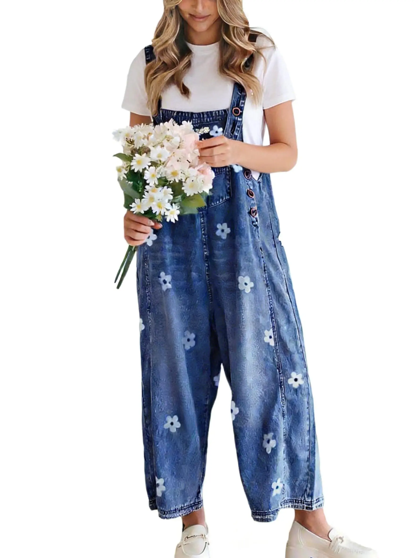 ·【STYLE】loose fit denim overalls for women/ baggy denim bib overall/ wide leg denim pants overalls for women/ adjustable strap denim overall/ vintage flower printed wide leg jeans/ retro street distressed denim overall for women/ sleeveless denim jumper jumpsuit/ denim long romper/ one piece outfits/ work clothes for women/ womens clothing trendy 2025/ womens fashion 2025/ 2025 fashion fall clothes for women
