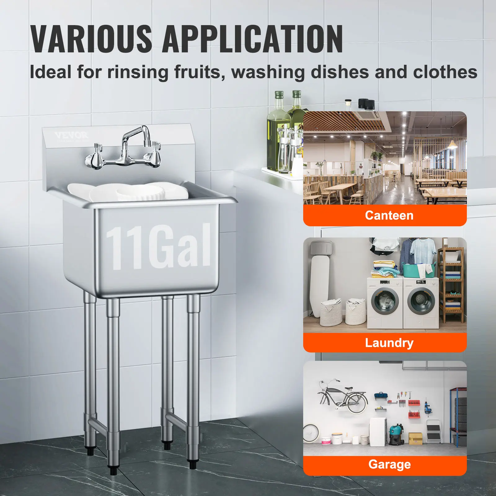 • Utility Sink for Commercial Use: This stainless prep sink is easy to assemble and includes all necessary accessories, with premium packaging. It is designed to efficiently accommodate fruits and vegetables, making washing more convenient. The sink suits various settings, such as commercial kitchens, laundry rooms, bars, restaurants, and garages. Tips: For your security, it is recommended to wear gloves during installation.