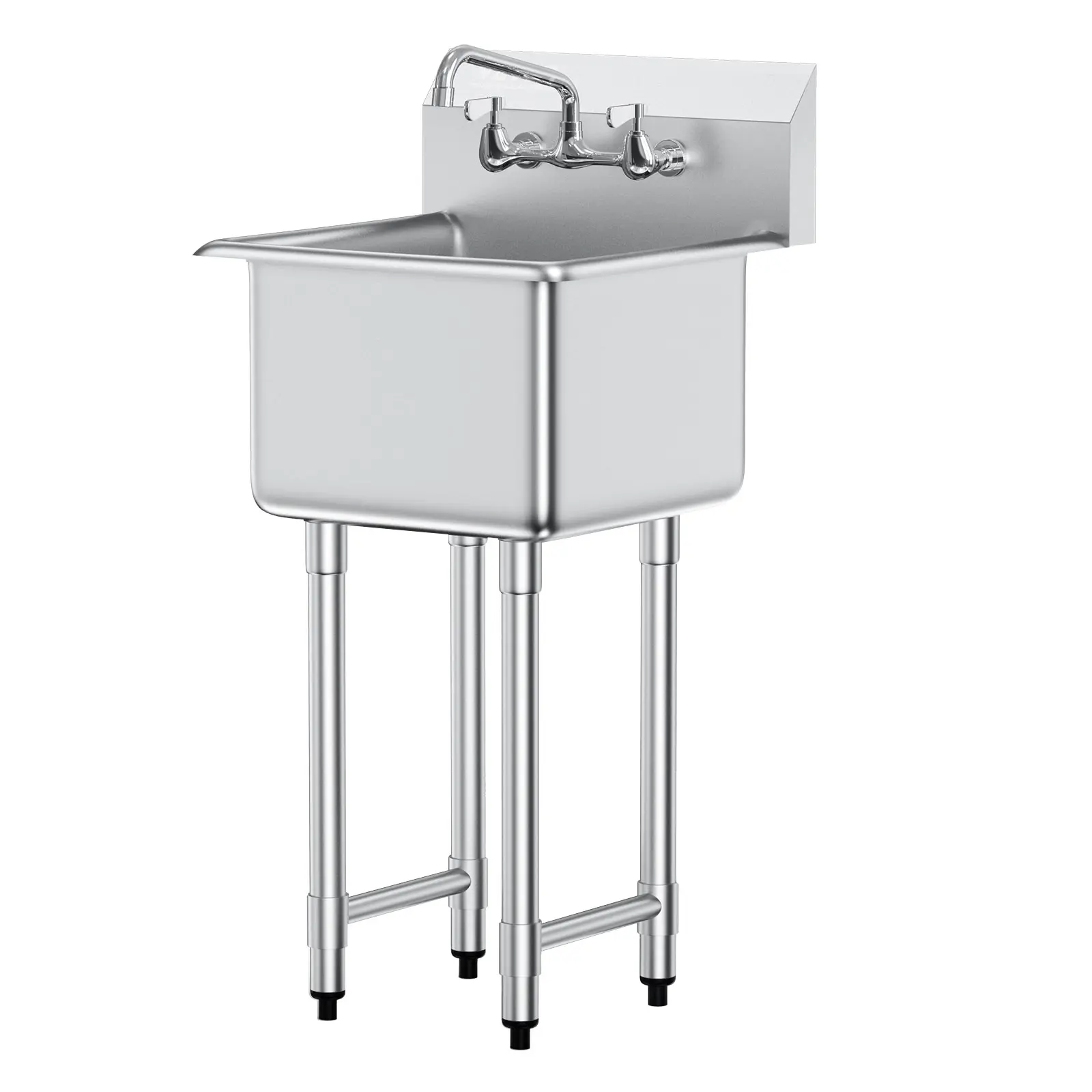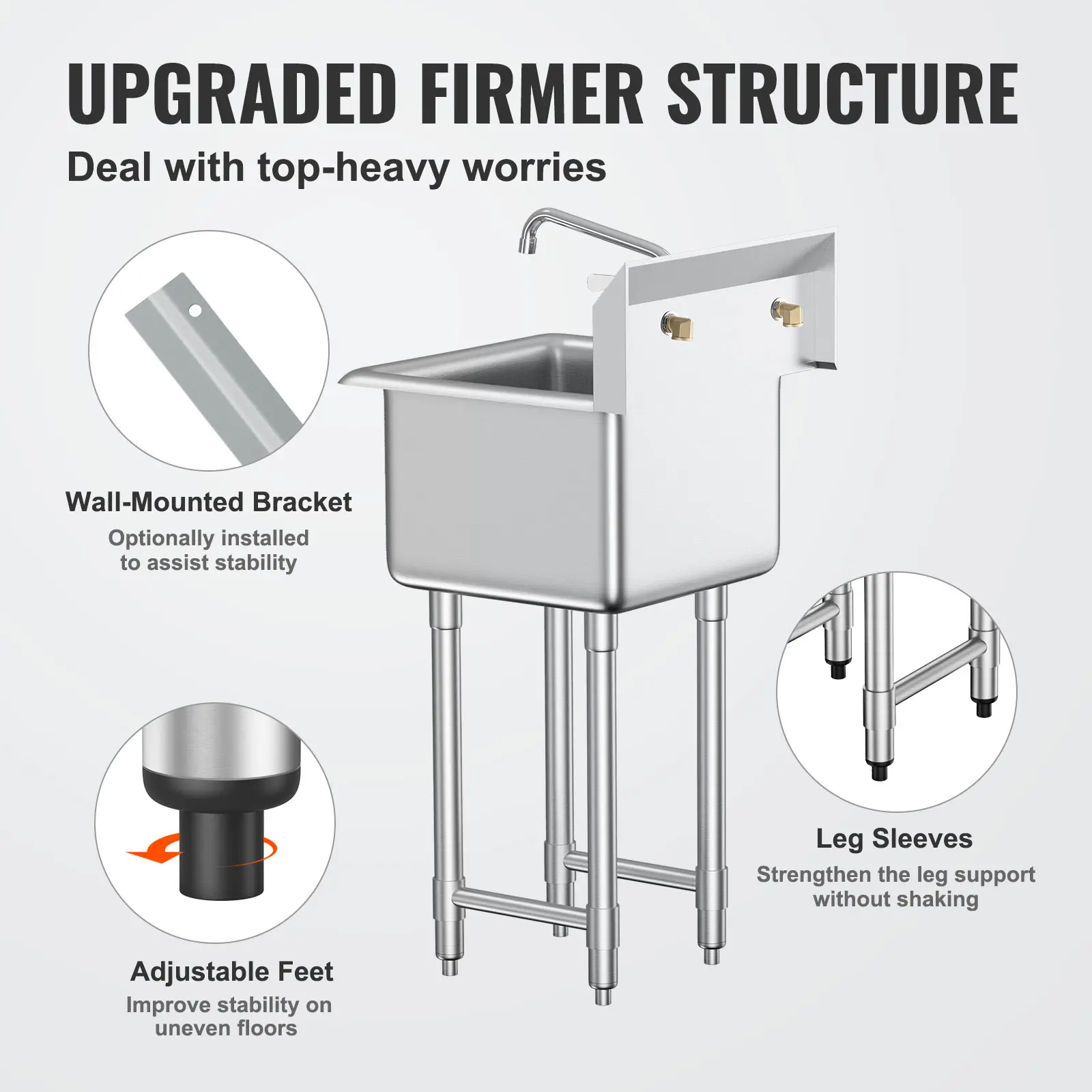 • Robust & Durable Structure: This stainless steel utility sink with legs is designed to be extremely sturdy, with leg sleeves and adjustable levelers that safeguard your floor against scratches and ensure stability, even on uneven surfaces. The wall-mounted bracket provides an additional option for added stability.
