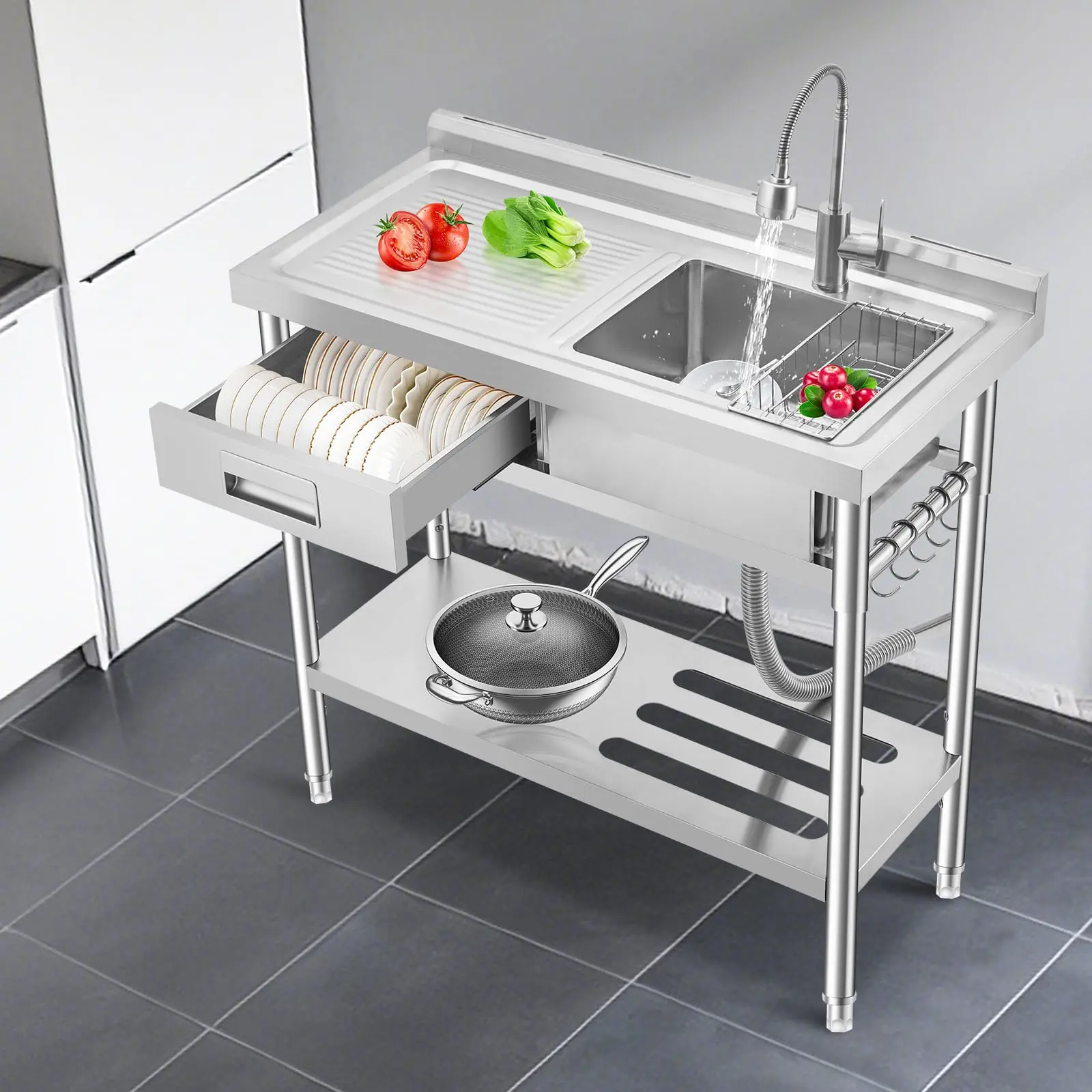 · Superior 304 stainless steel utility basin with integrated workbench—perfect for commercial kitchens, laundry rooms, garages, or outdoor use. Durable, rust-resistant, and built to last.