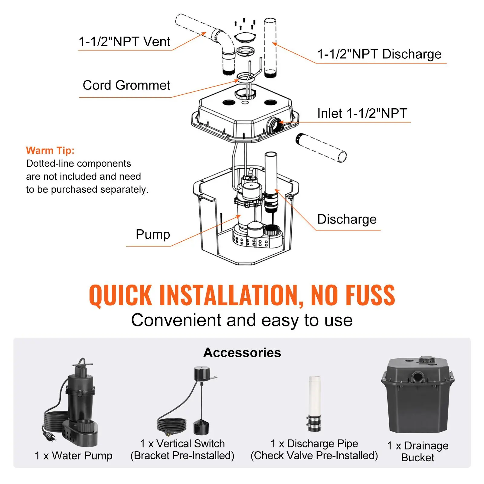 • Easy Installation: Installing our under-sink sump pump is a breeze! Just attach the pump, vertical switch, and discharge pipe to your drainage bucket, and you're good to go. No need for complicated setups or lengthy instructions – get it done in no time and start enjoying a dry, hassle-free basement today!
