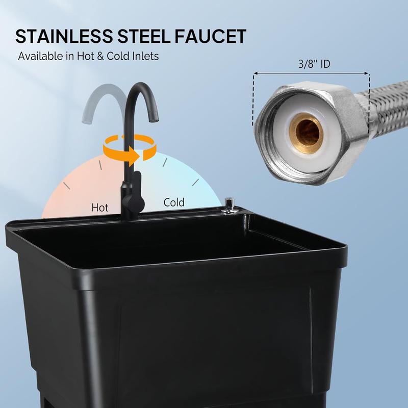 5. ROVSUN Plastic Utility Sink, Freestanding Sink with Hot&Cold Faucet, Soap Dispenser, Drain Plug and Iron Legs with Storage shelf, Perfect for Basement, Laundry Room, Garage, Black 23.6"×23.6"×36.2"
