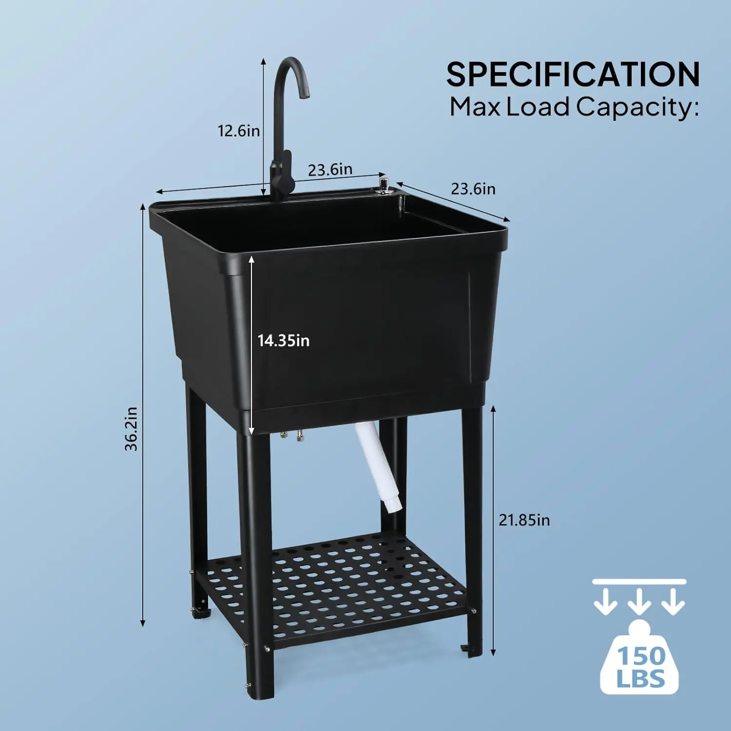 5. ROVSUN Plastic Utility Sink, Freestanding Sink with Hot&Cold Faucet, Soap Dispenser, Drain Plug and Iron Legs with Storage shelf, Perfect for Basement, Laundry Room, Garage, Black 23.6"×23.6"×36.2" SpringStatements