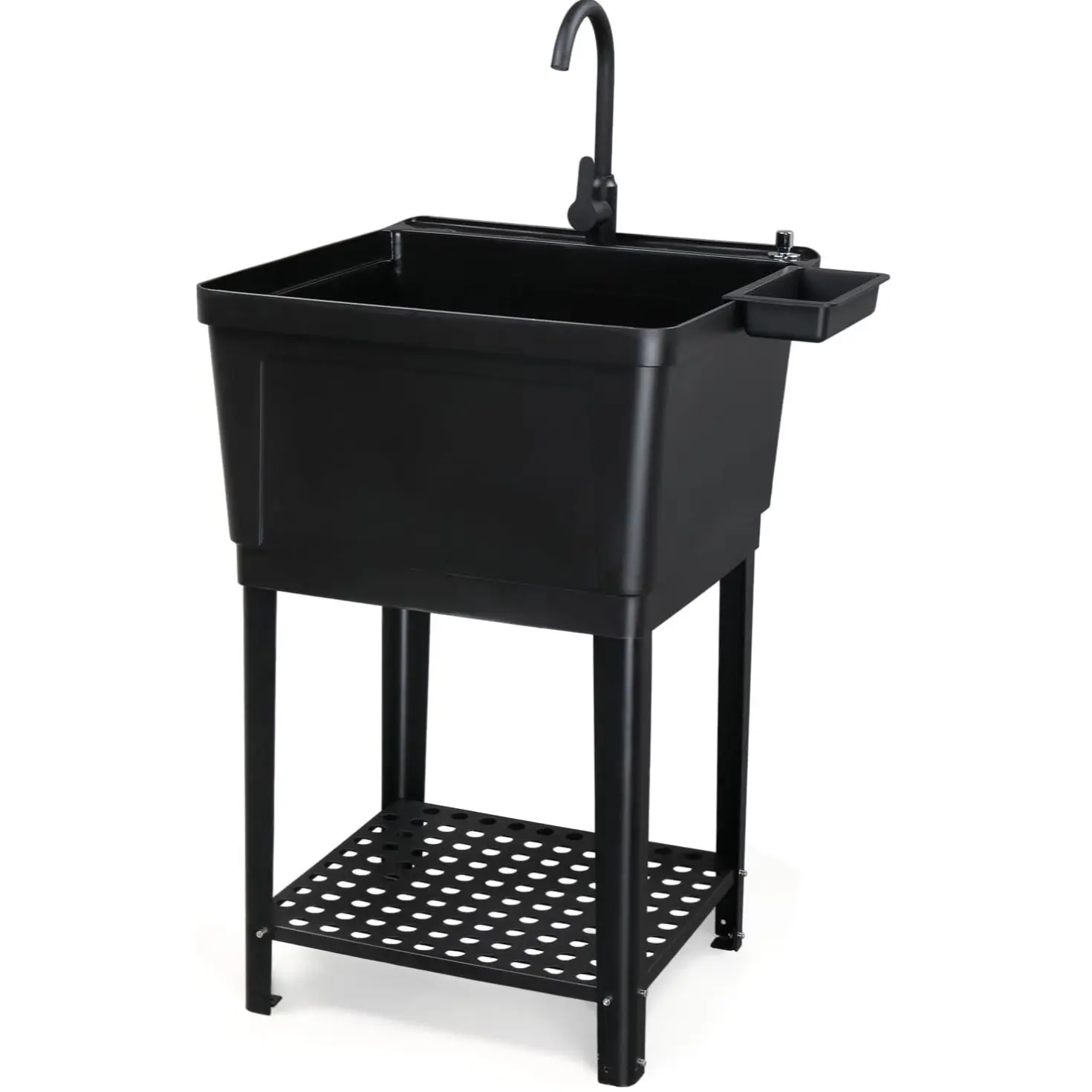 ROVSUN Plastic Utility Sink, Freestanding Sink with Hot&Cold Faucet, Soap Dispenser, Drain Plug and Iron Legs with Storage shelf, Perfect for Basement, Laundry Room, Garage, Black 23.6"×23.6"×36.2" SpringStatements
