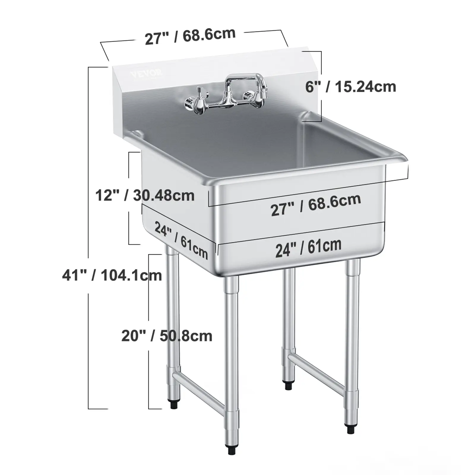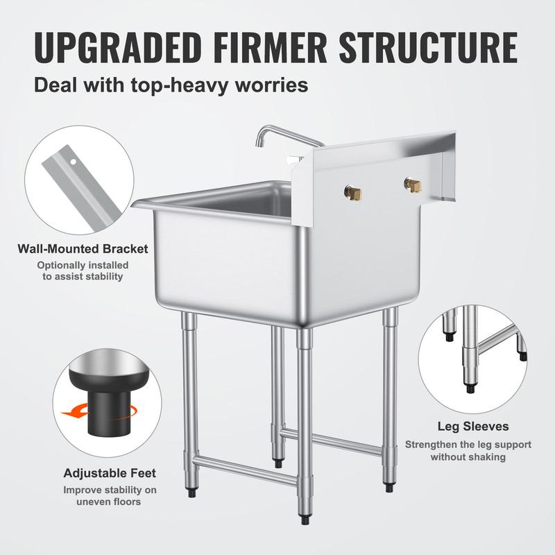 • Robust & Durable Structure: This stainless steel utility sink with legs is designed to be extremely sturdy, with leg sleeves and adjustable levelers that safeguard your floor against scratches and ensure stability, even on uneven surfaces. The wall-mounted bracket provides an additional option for added stability.