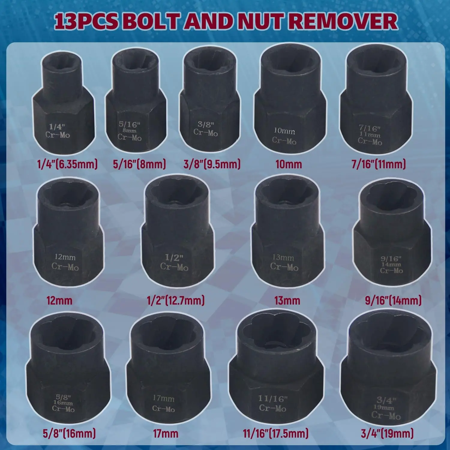 13PCS BOLT AND NUT REMOVER: 3/8 Drive Nut Remover including sizes of 1/4"(6.35mm), 5/16"(8mm), 3/8”(9.5mm), 10mm, 7/16”(11mm), 12mm, 1/2”(12.7mm), 13mm, 9/16”(14mm), 5/8”(16mm), 17mm, 11/16”(17.5mm), 3/4”(19mm).