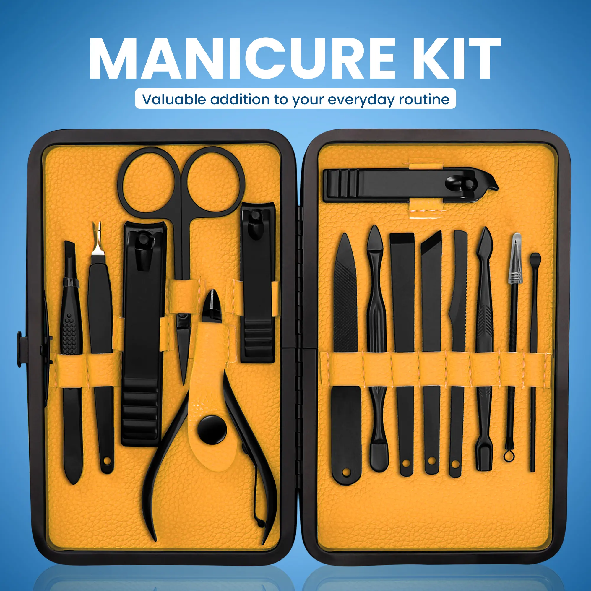 • Complete 16-Piece Manicure & Pedicure Set – Includes fingernail & toenail clippers, cuticle trimmer, nail file, tweezers, scissors, blackhead remover, ear pick, and more for full hand, foot, and facial care.