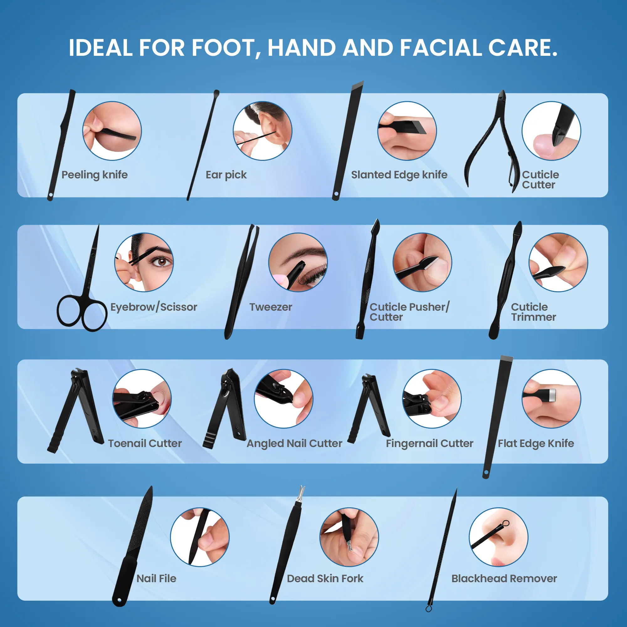 • All-in-One Grooming Solution – Designed for hand care, foot care, facial care, and eyebrow shaping in one compact professional kit.