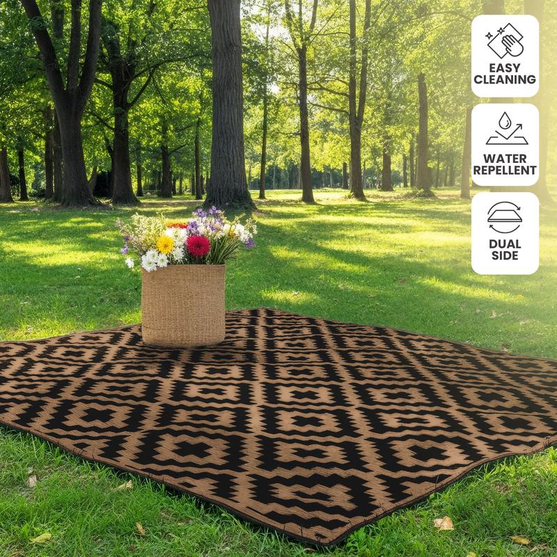 This rug is suitable for multiple settings. Use it on decks, patios, or as a camper rug. Its waterproof feature ensures durability in wet conditions. The black and brown color scheme complements any outdoor decor. Enjoy a cozy, stylish area under your awning or on your balcony.