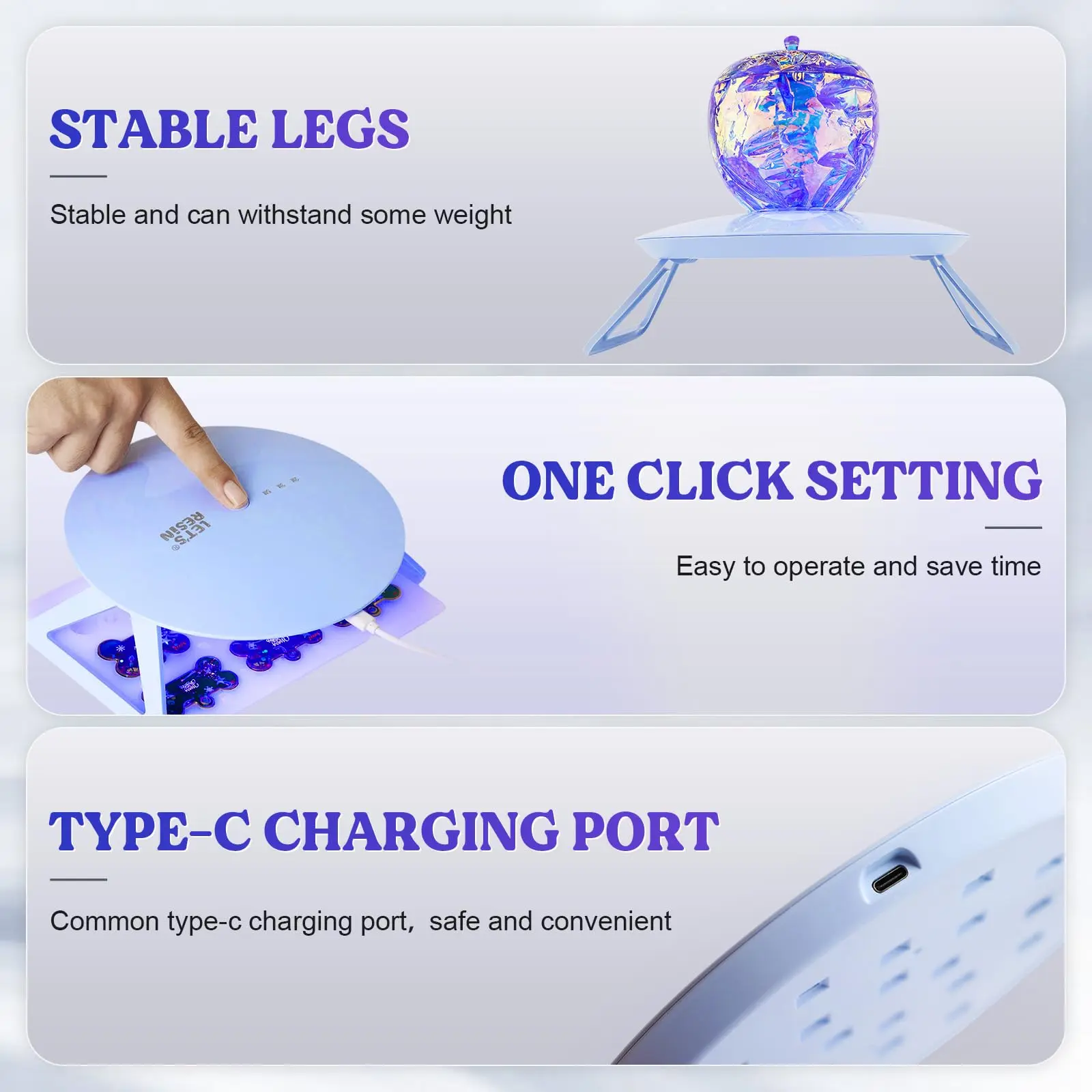 ·Foldable &Portable-Perfect Size for Storing:Our UV resin light feature a foldable design for easy storage. Reinforced ABS material legs provide higher quality assurance.At the same time, we provide you with a sweet curing time suggestion: 2-3min suitable for 2 to 10mm layers, while 5 minutes for layers under 2mm.