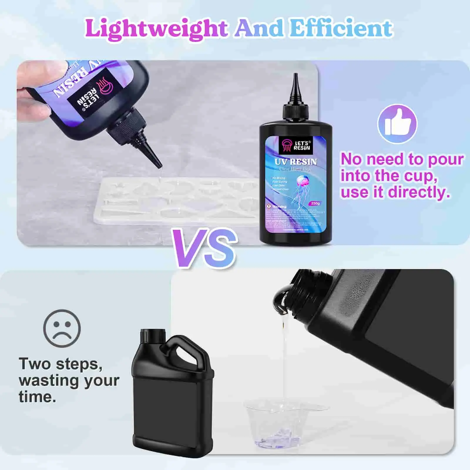 ·Faster Curing: UV resin beats AB epoxy resin with its quick curing time and no mixing. We are dedicated to professionally researching and developing high-quality UV epoxy resin, promising rapid, effective curing using UV or UV light in minutes, leaving a non-sticky resin finish.