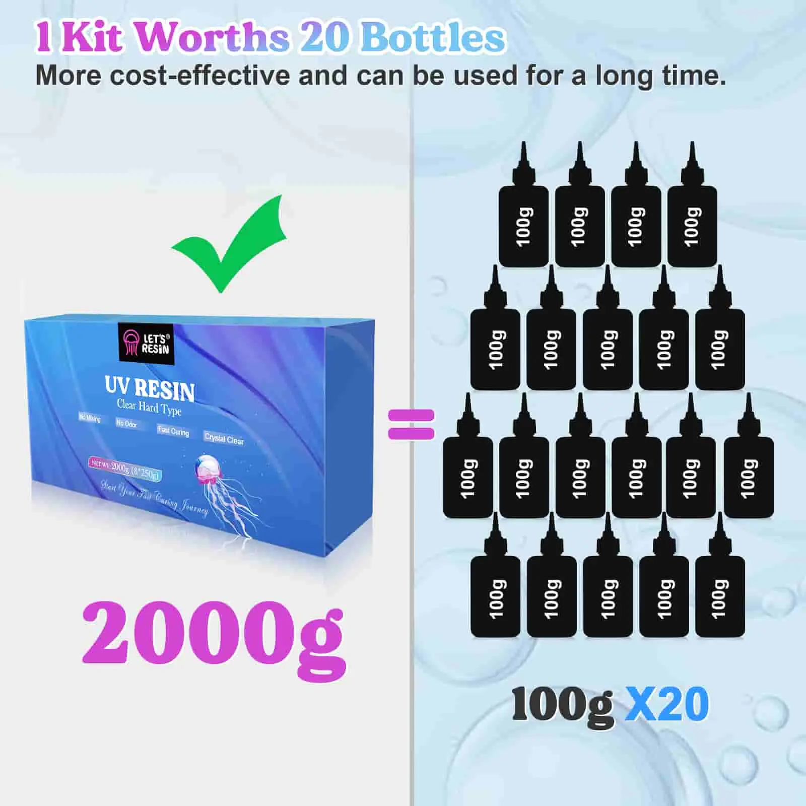 ·Cost-effective Bulk Option: Our 2000g UV resin bulk offers great value. It's 20 times the capacity for quarter the price of 100g small bottles, Effortlessly apply 2000g UV resin kit with 8 convenient 250ml bottles. Skip the cup pouring – use directly for enhanced efficiency, doubling productivity, and ensurin biggest cost-effectivenes.