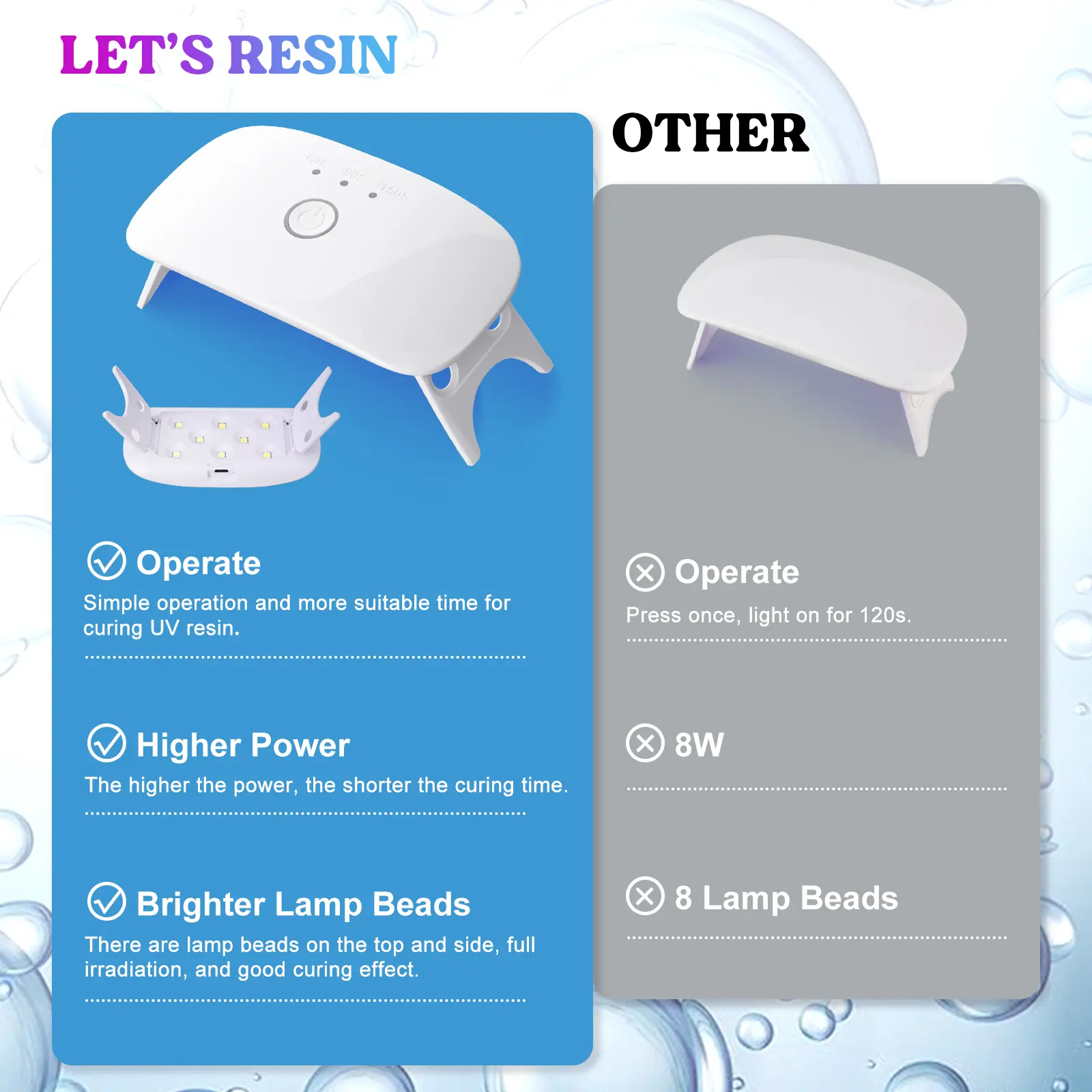 ·More Efficient Tools: Comparing many UV lights, we selected this UV lamp to improve your work efficiency, the higher the power, the shorter the curing time. The light has 12 lamp beads, which can fully Irradiate your crafts. Press once, it turns off after 60s, long press for 3s, and turns off after 120s. We are also equipped with mixing tools and a silicone mat. They can help you keep the desktop clean during operation, and can mix a variety of colors to create more unique UV resin works.