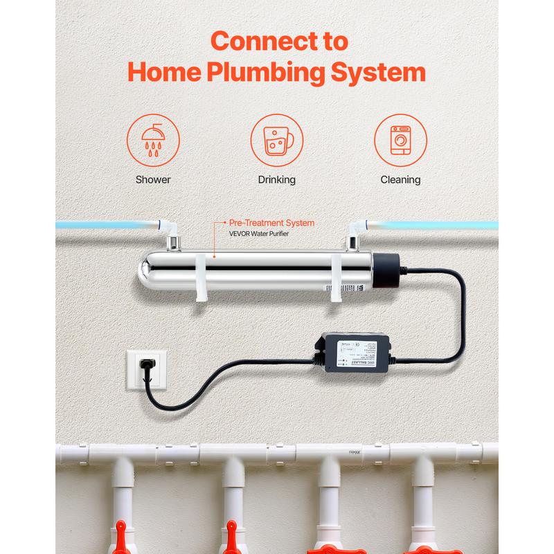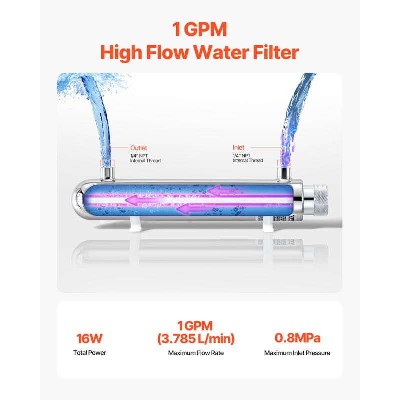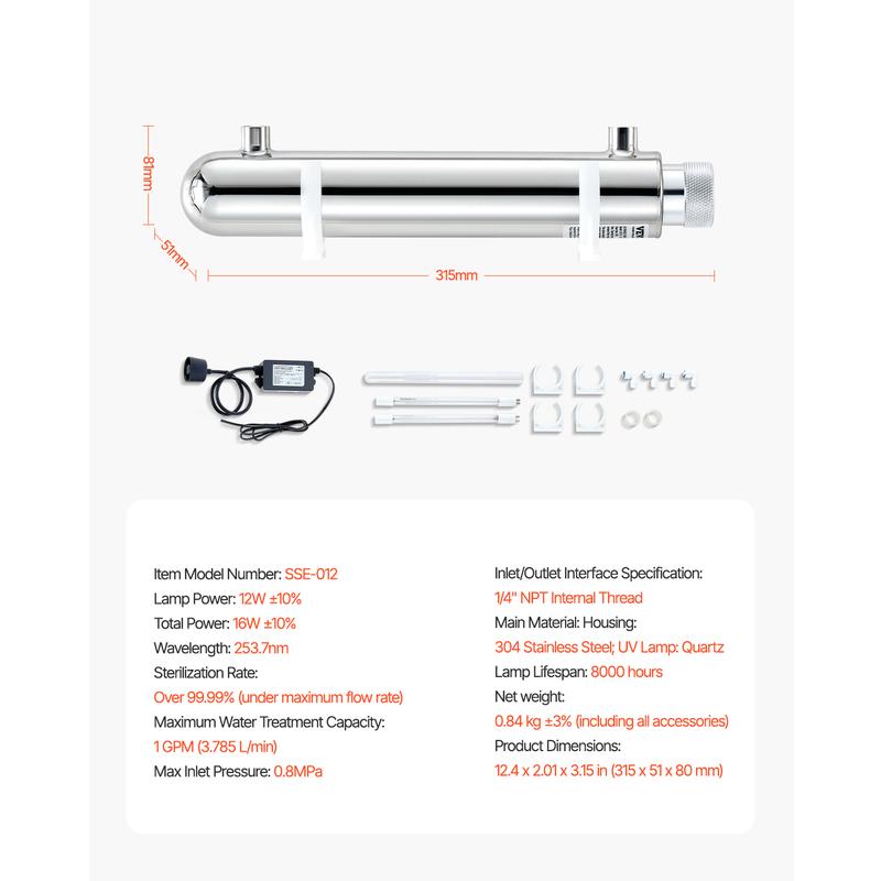 5. VEVOR UV Water Purifier, 12W 1GPM, 110V Versatile Ultraviolet Water Purifier Filter with Stainless Steel Housing, Whole House UV Water Filter with Quartz Sleeve Fit for Shower/Drinking/Cleaning