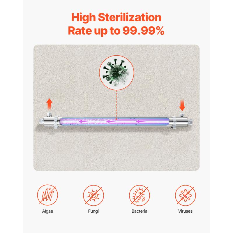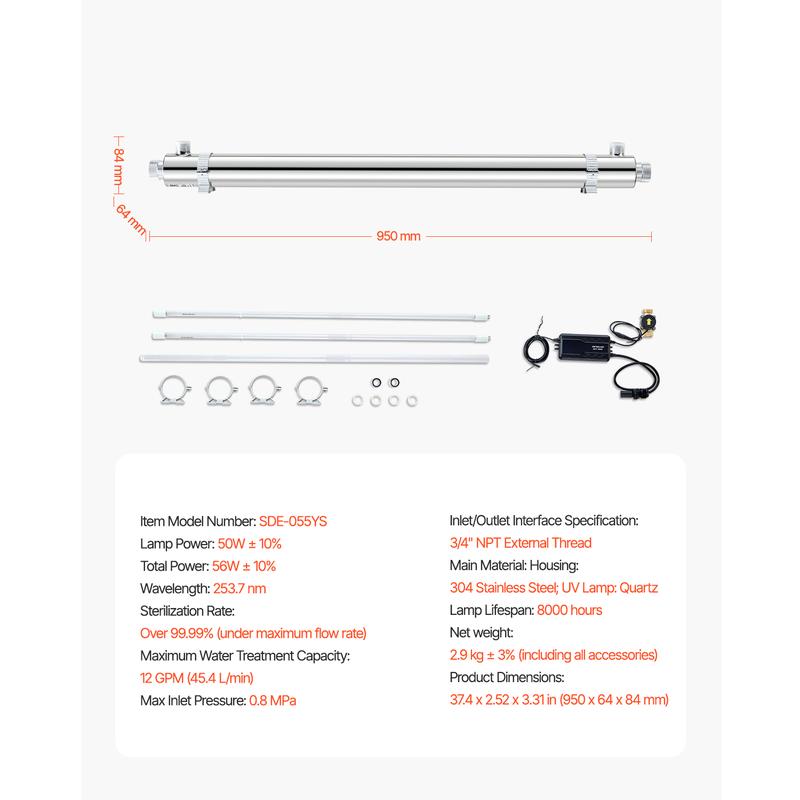 • Complete Accessories: 1 x Stainless Steel Main Body Tube, 2 x Light Tubes (1 required, 1 extra included), 1 x Quartz Glass Sleeve, 1 x Power Ballast, 4 x Mounting Brackets (2 required, 2 extra included), 2 x Sealing Rings (1 required, 1 extra included), 4 x Quick Connectors, 1 x Tape. If any parts are missing or damaged, please contact us for free compensation.