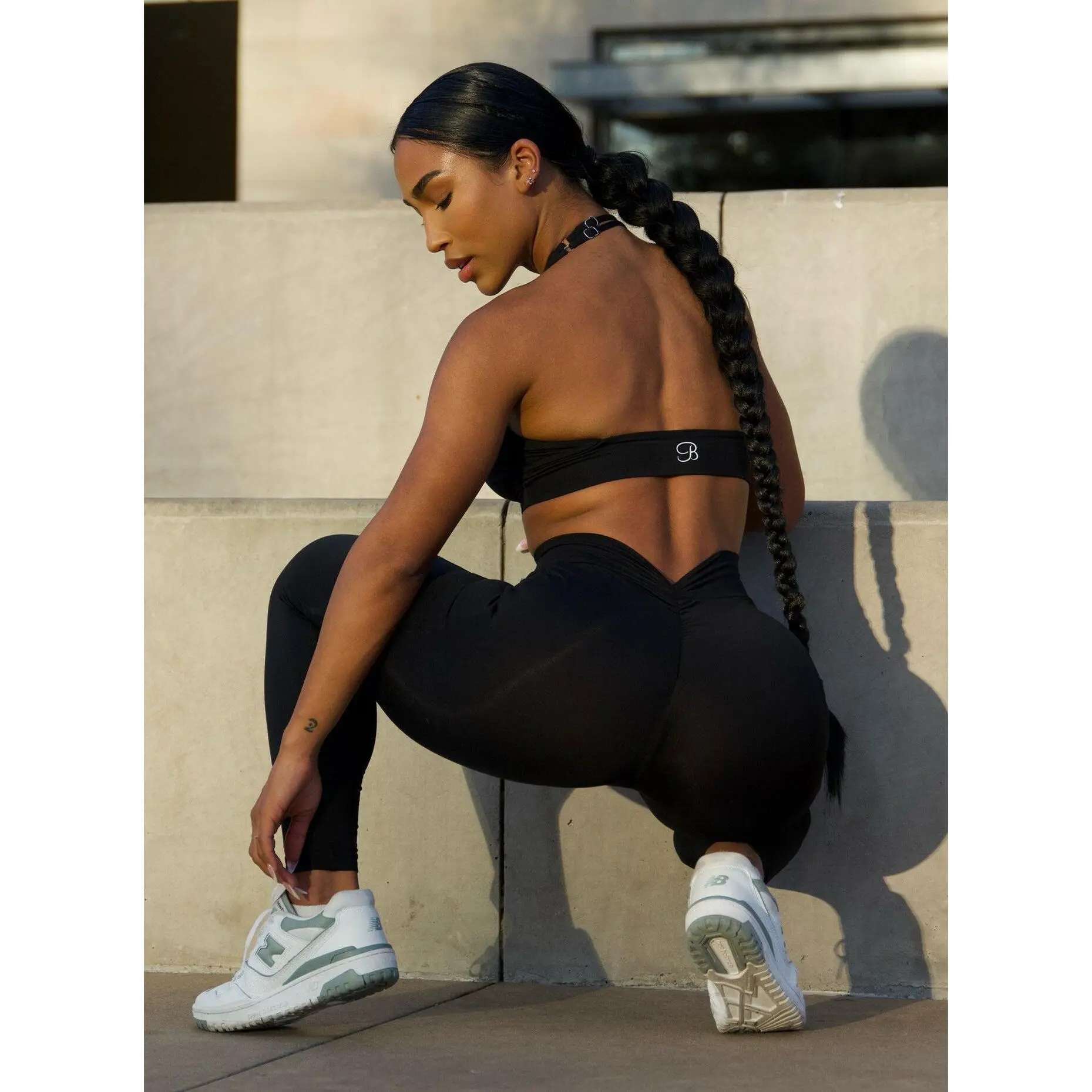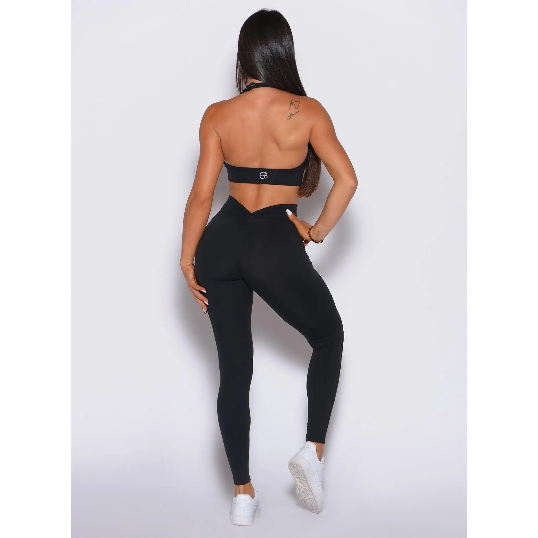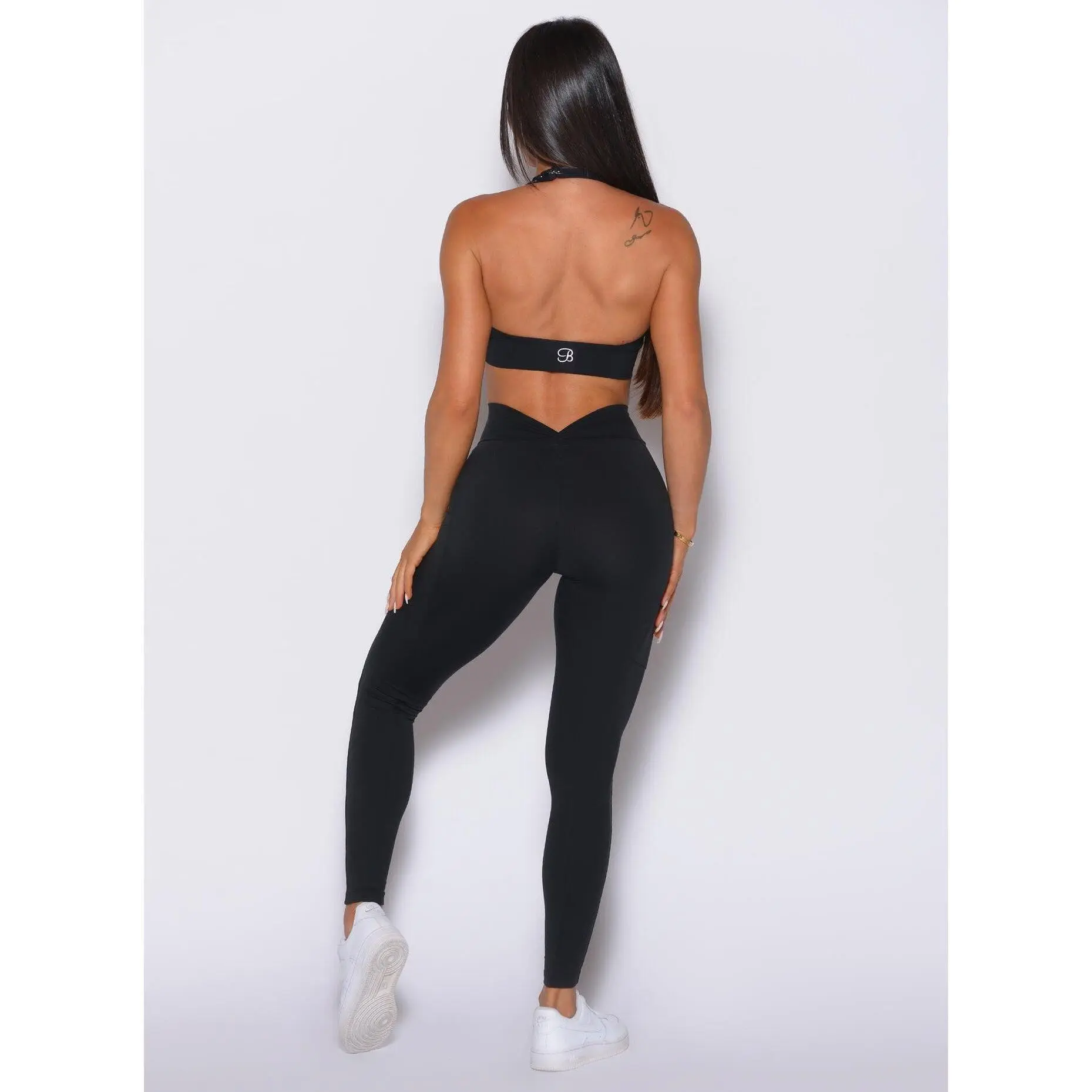 Ladies, prepare to fall in love with the leggings that will undoubtedly have everyone talking! Introducing our V-Back Leggings, your soon-to-be favorite gym outfit. These leggings are expertly designed, featuring a sexy V-scrunch back and convenient side pockets, offering both style and comfort. With a double-layered, high-waisted front, these leggings provide a flattering fit that's unlike any other. Made with our black second-skin fabric, they are exceptionally soft with incredible snap-back recovery. For the ultimate gym look, consider pairing them with our matching Backless Bra.