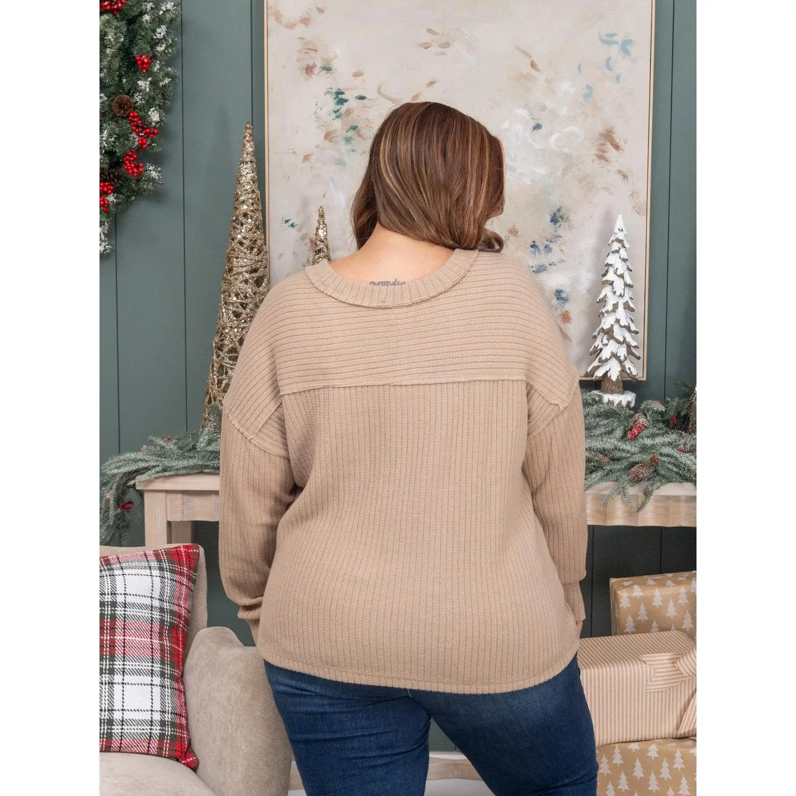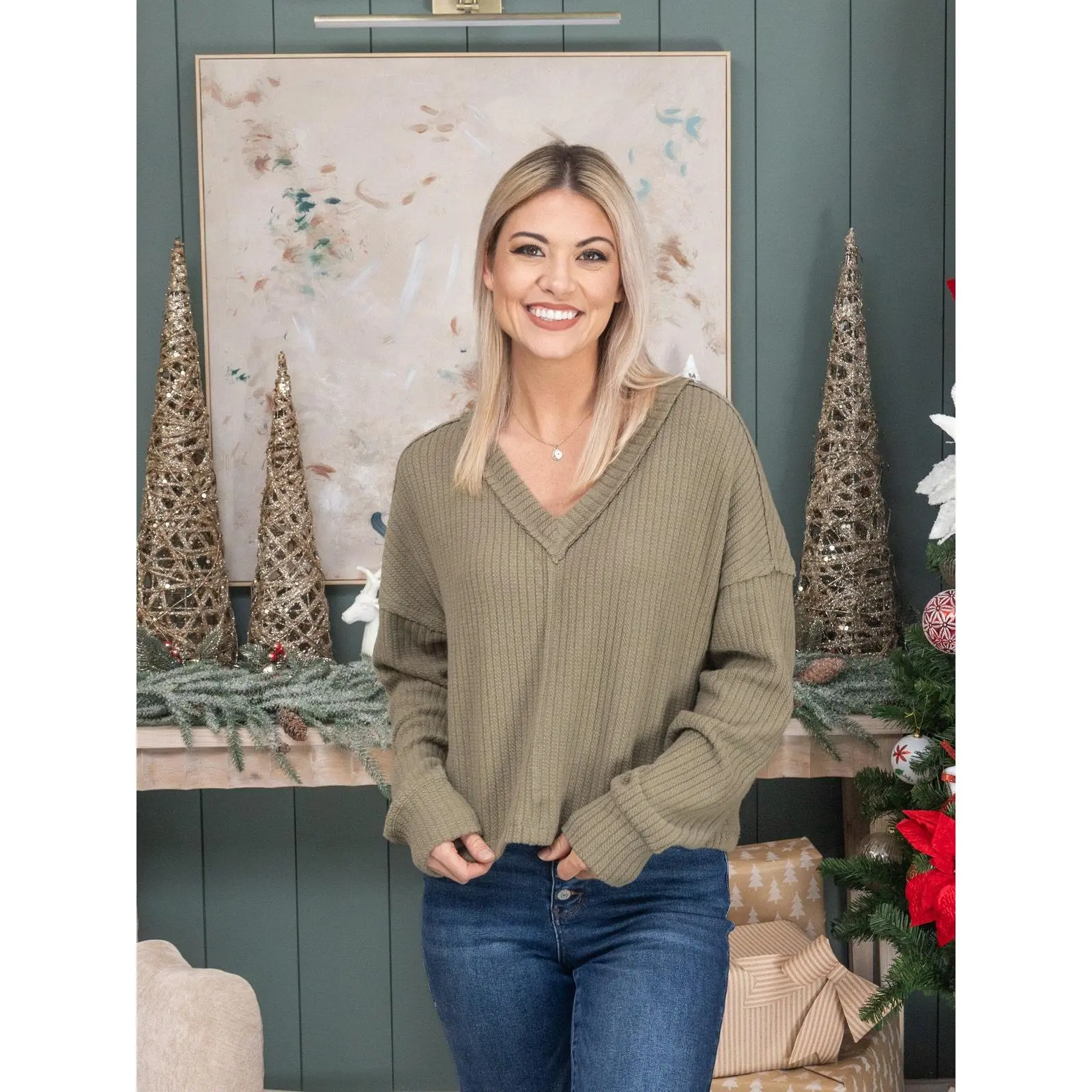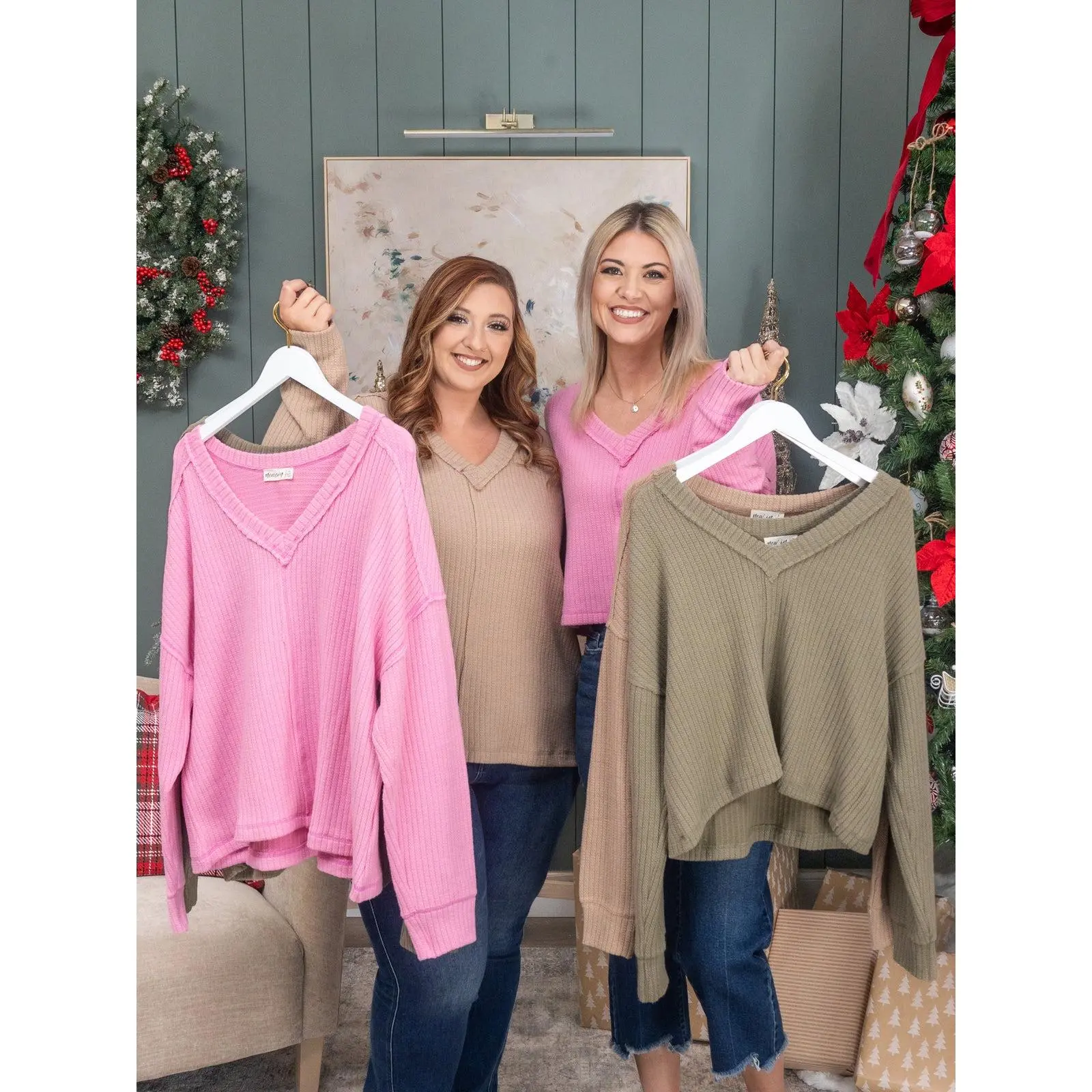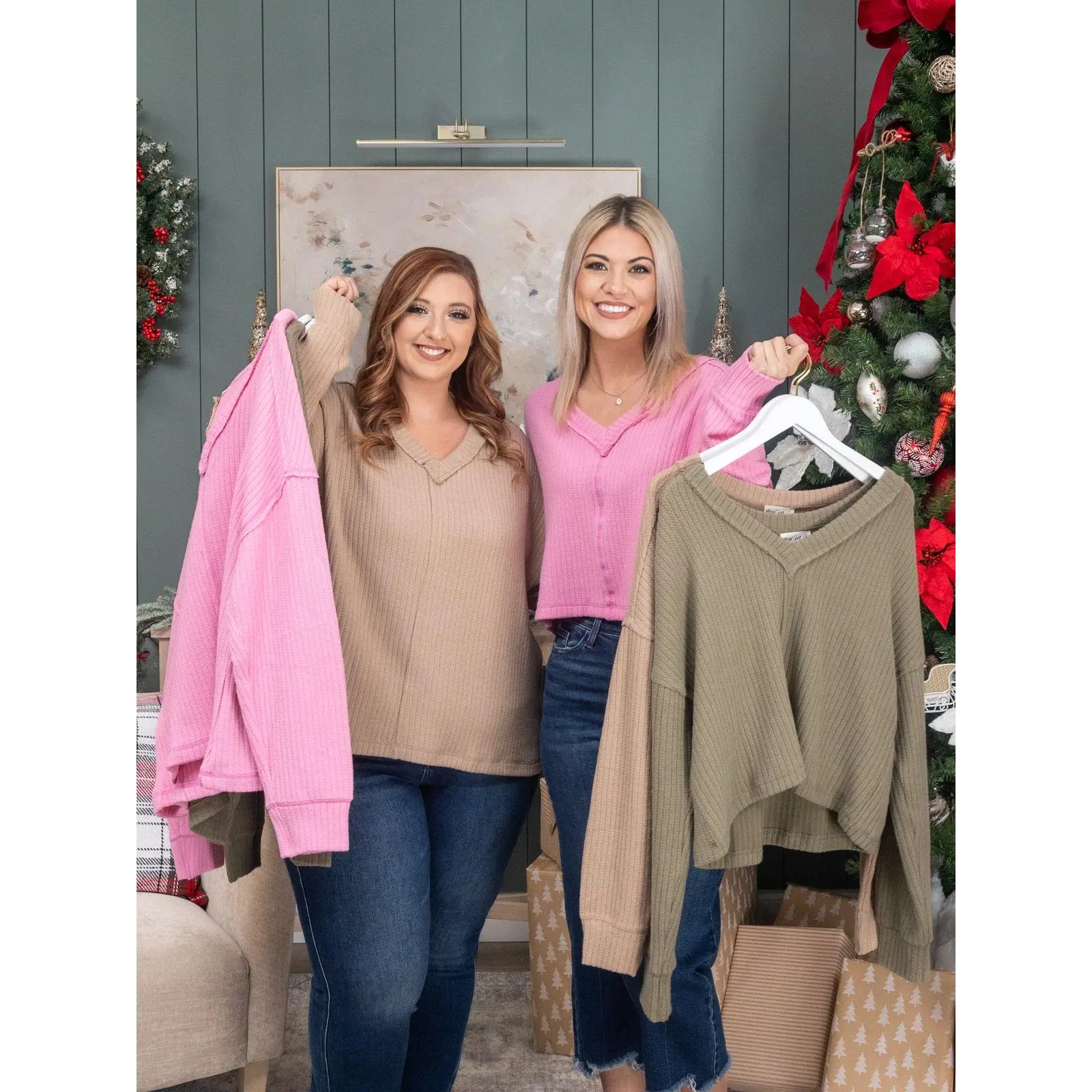 Brittany is 5'10, 36B bra, typically wears size S in tops and 3/5 in denim. Wearing size S. Erin is 5'8, 36C bra, typically wears size L/XL in tops and 14/15 in denim. Wearing size 1X. This fits tts, the length for the plus size is longer than the S-L. If you are between sizes you can size down for a tighter fit or size up for a more oversized fit. Features: V-Neck, Long Sleeve, Knit Medium Measurements: Bust- 46"/ Length- 22" 2XL Measurements: Bust- 52"/ Length- 27" Materials: 68% Polyester, 29% Cotton, 3% Spandex Brand: Very J sku: 57412 No returns or exchanges!