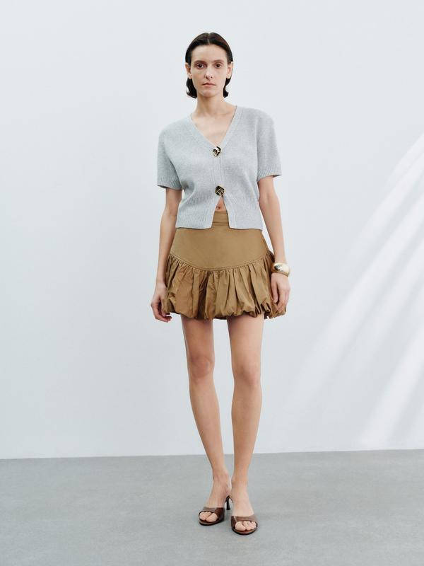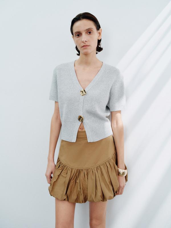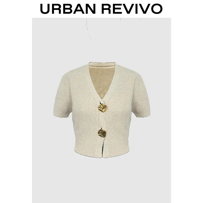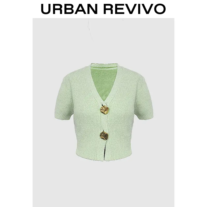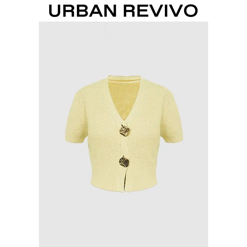 URBAN REVIVO Minimalist V-Neck Short-Sleeve Knit Cardigan Chunky Metal Button Detail Cropped Top