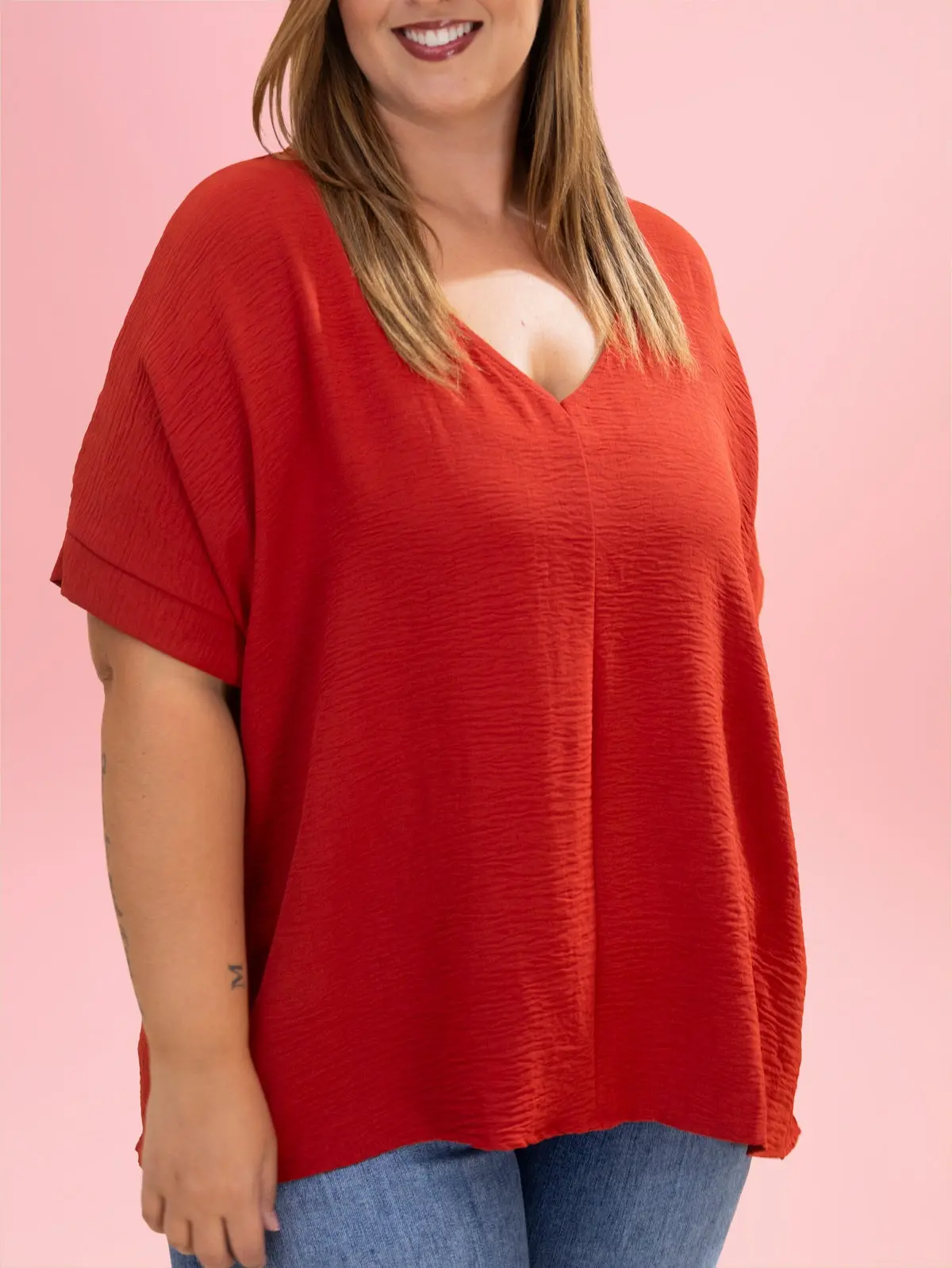 Nice bright color and I love the material. Perfect summer top. Arrived quickly.