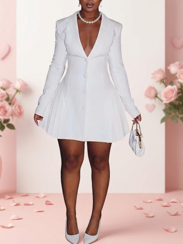 Women's Solid Color V Neck Pleated Dress, Casual Long Sleeve Dress for Spring, Ladies Clothes for Daily Wear