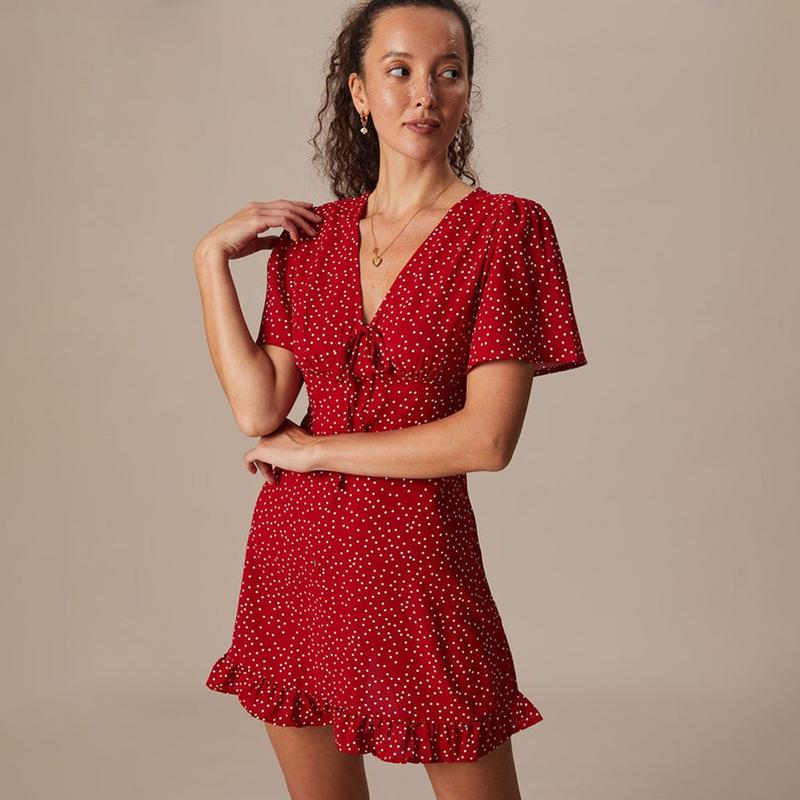 The Red V Neck Polka Dot Flounce Mini Dress Casual Summer