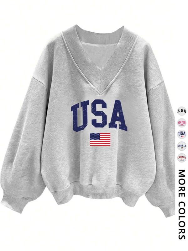 Women's Letter Print V Neck Pullover Sweatshirt, Casual Long Sleeve Sweatshirt for Daily Wear, Ladies Clothes for All Seasons