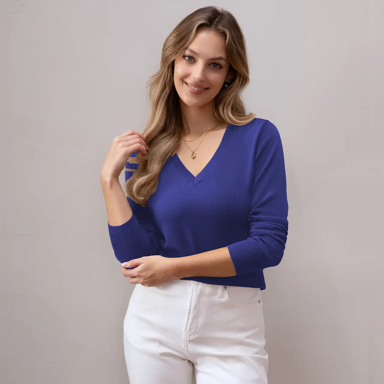 QUALFORT Womenβs Long Sleeve Vneck Knit Sweater Solid Color Tops