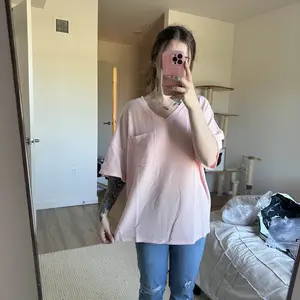 Love this soft pink shirt! I’m 6ft tall and I got an XL so that it’s flown and loose!