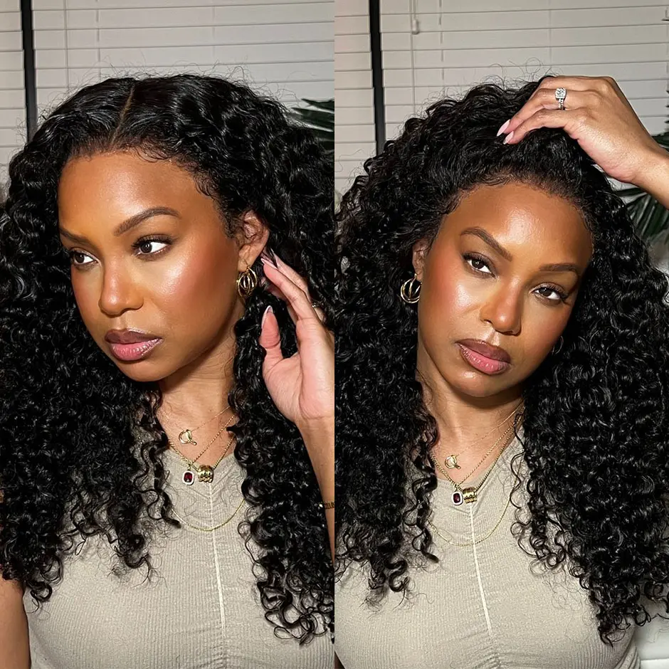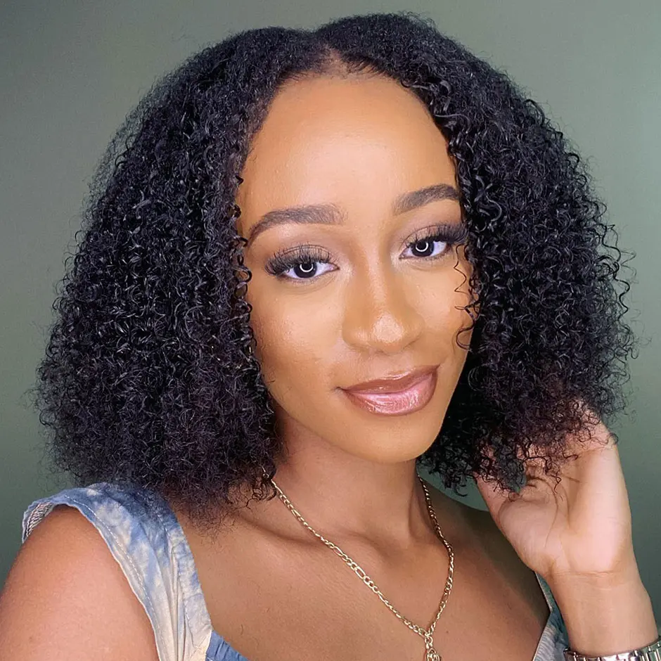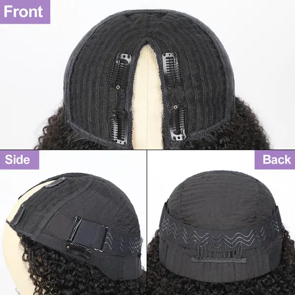 MORE FACE V Part Bob Wig Glueless Kinky Curly Human Hair Wigs With No Leave Out 180% Density Curly Human Hair Wigs Beginners Friendly