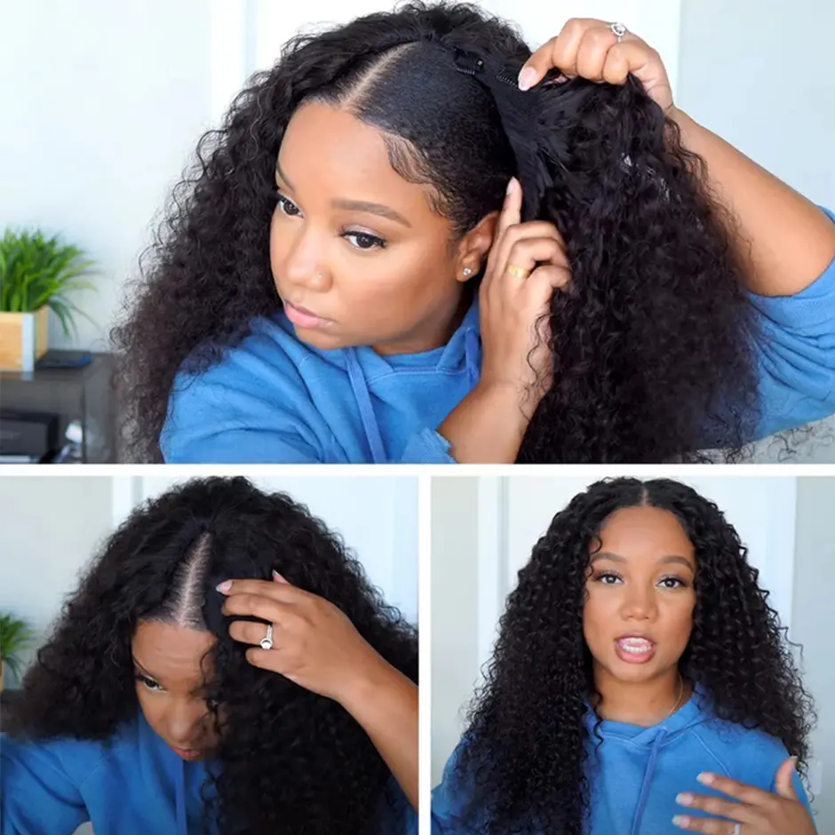 5. MORE FACE V Part Bob Wig Glueless Kinky Curly Human Hair Wigs With No Leave Out 180% Density Curly Human Hair Wigs Beginners Friendly