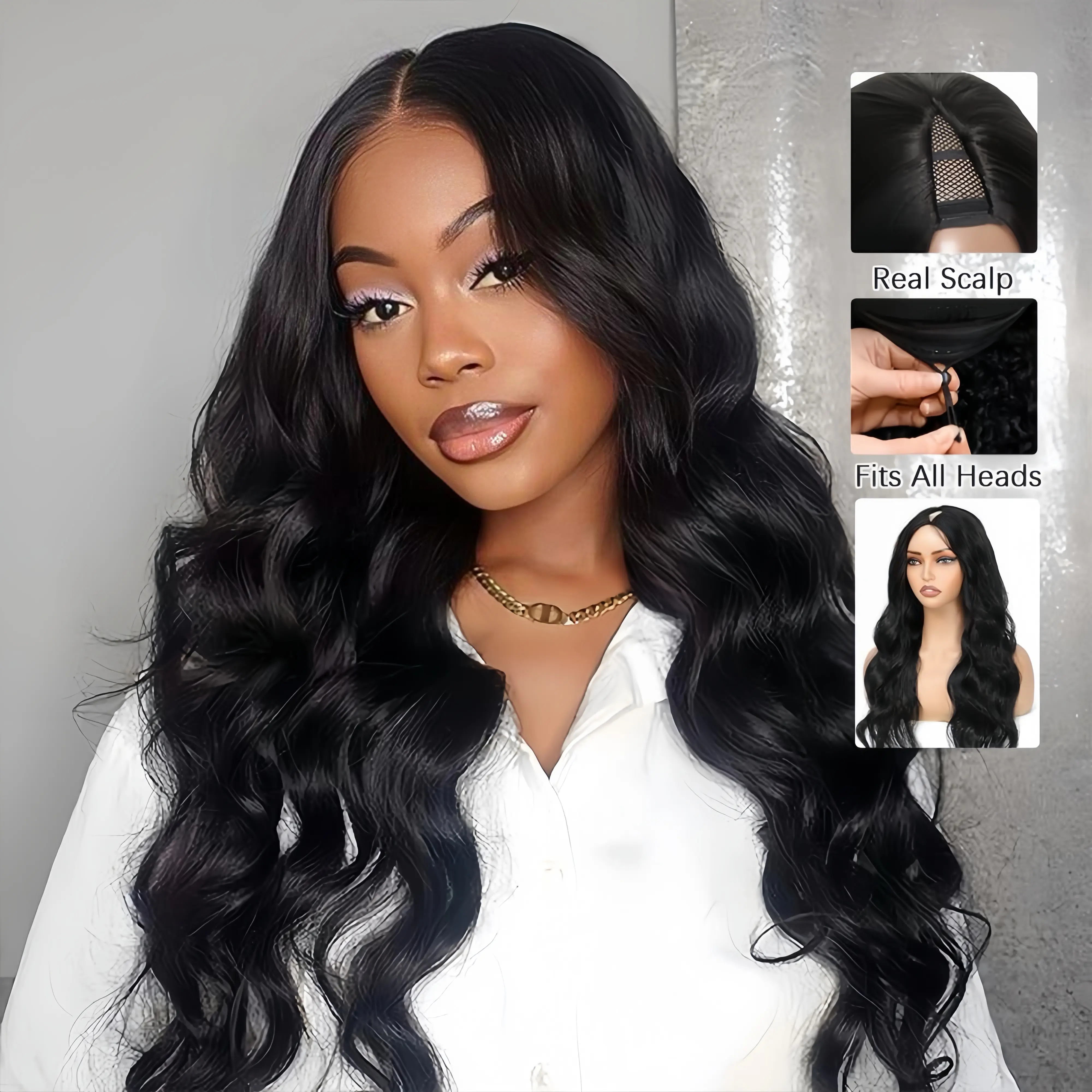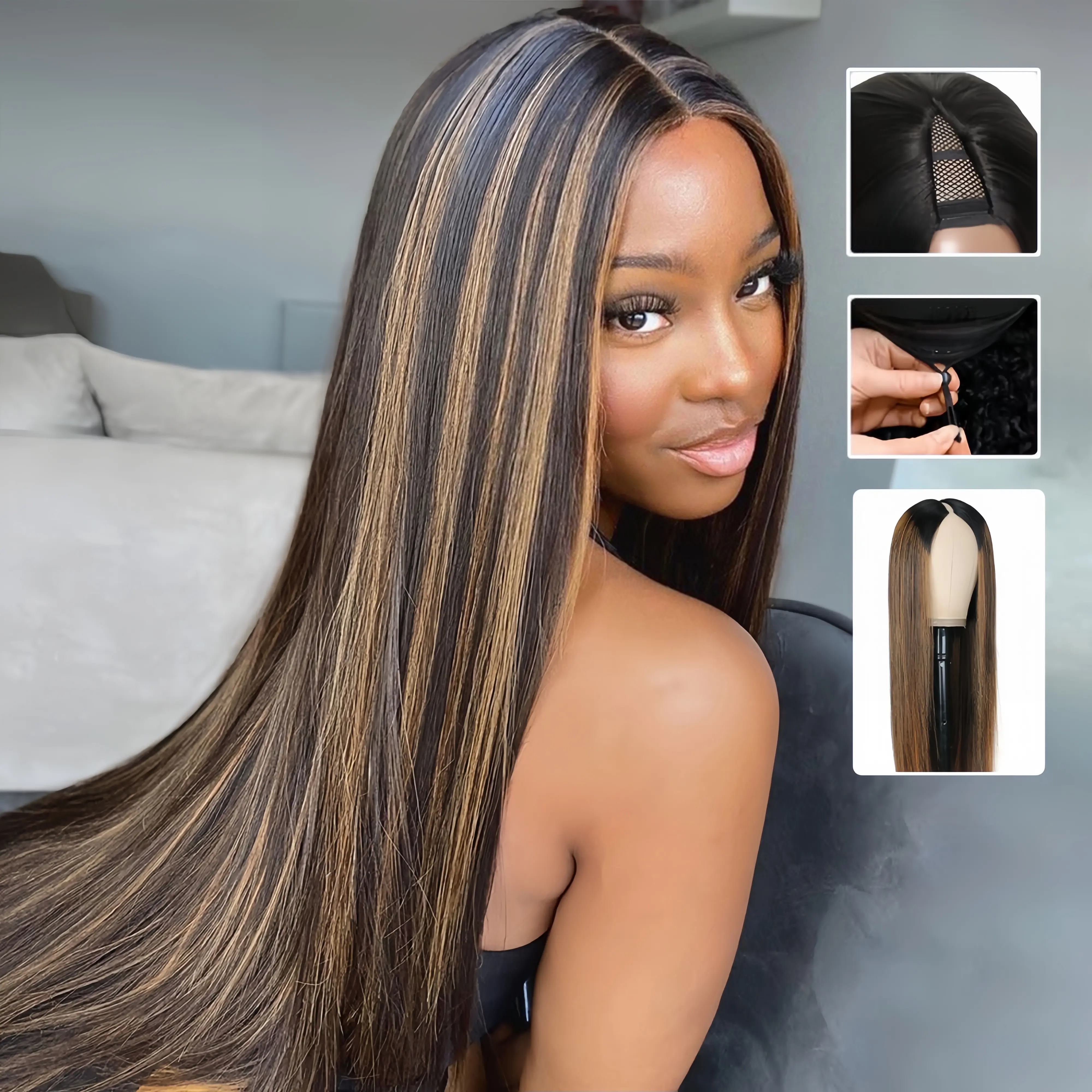 This v part wig is soo good. It matches my leave out perfectly & had clips and drawstrings for a more snug fit. I love it. Definitely my new go to