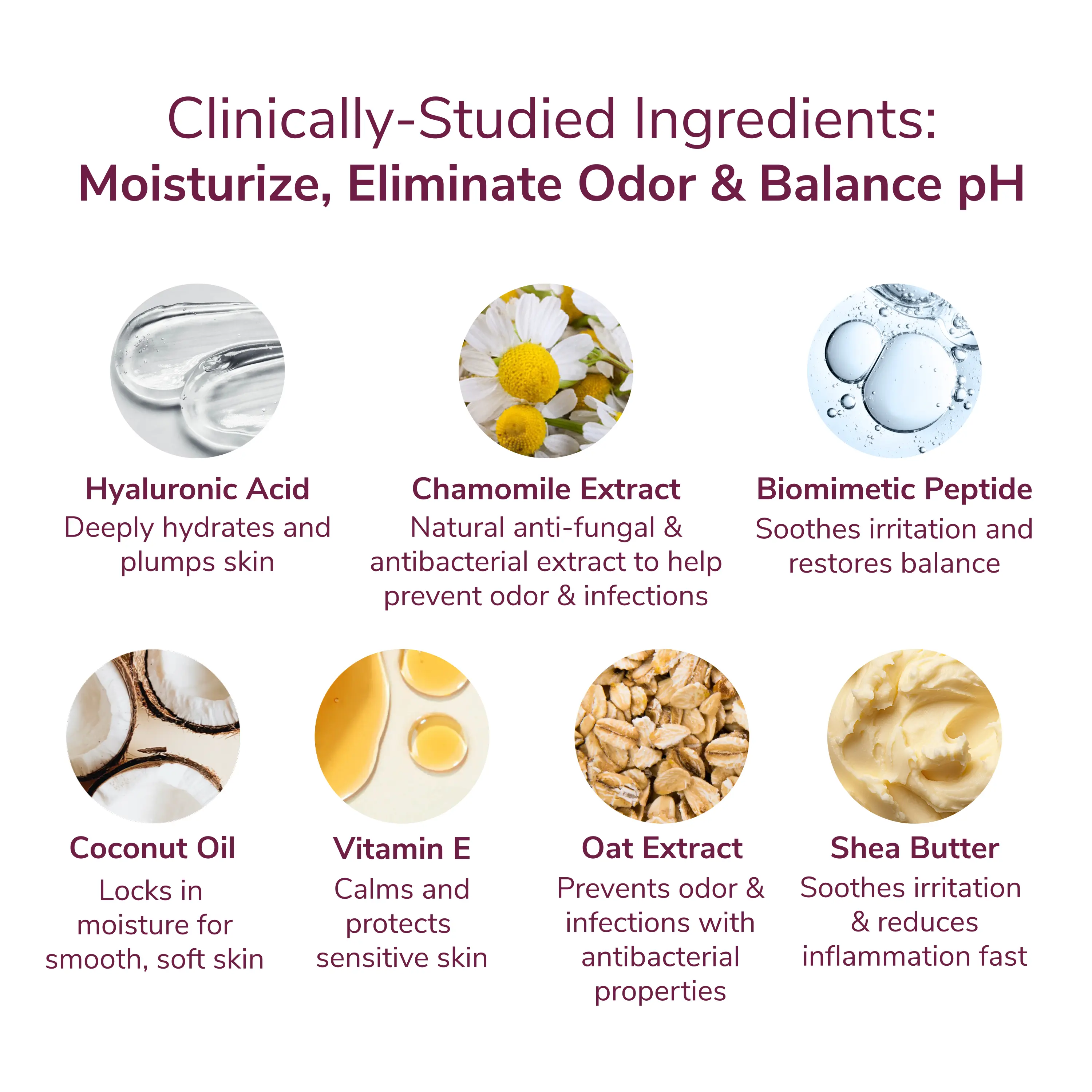 Science meets relief: Both formulas feature a clinically proven skin-calming peptide, paired with nourishing ingredients like hyaluronic acid, coconut oil, chamomile, oat kernel extract, and vitamin E. Together, they deeply hydrate, soothe irritation, support your skin barrier, and help keep your pH balanced—while helping prevent odor and infections.