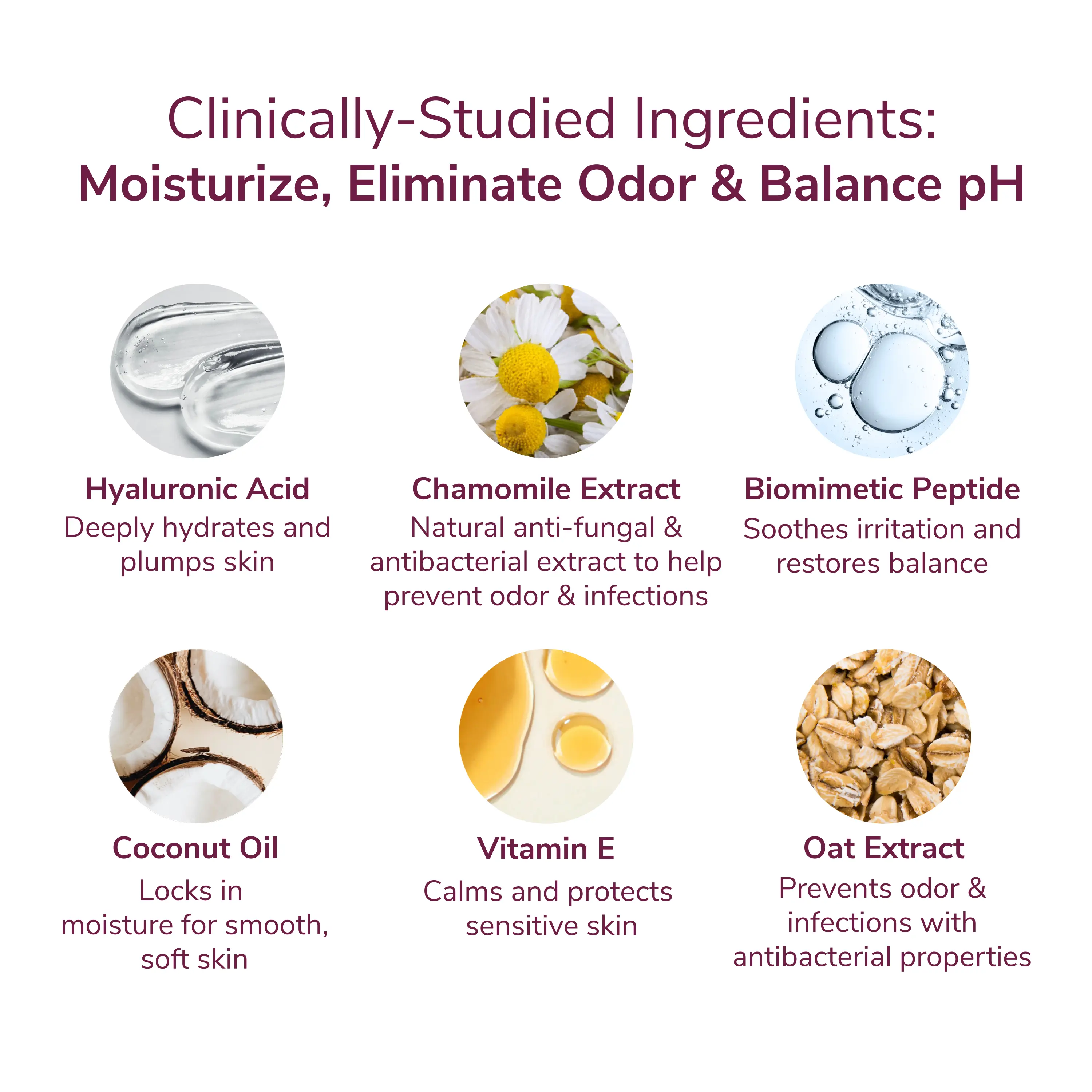 Science meets relief: Both formulas feature a clinically proven skin-calming peptide, paired with nourishing ingredients like hyaluronic acid, coconut oil, chamomile, oat kernel extract, and vitamin E. Together, they deeply hydrate, soothe irritation, support your skin barrier, and help keep your pH balanced—while helping prevent odor and infections.