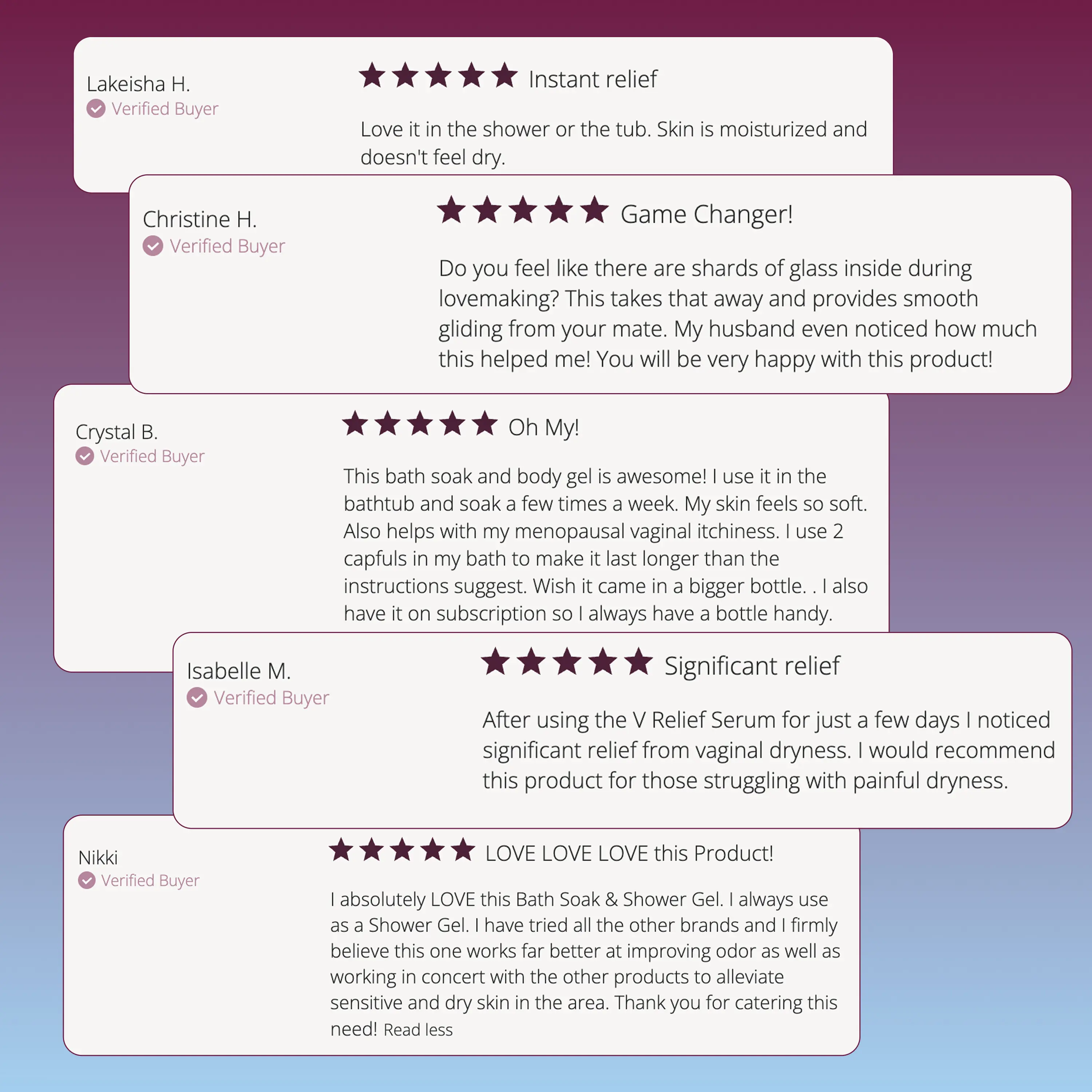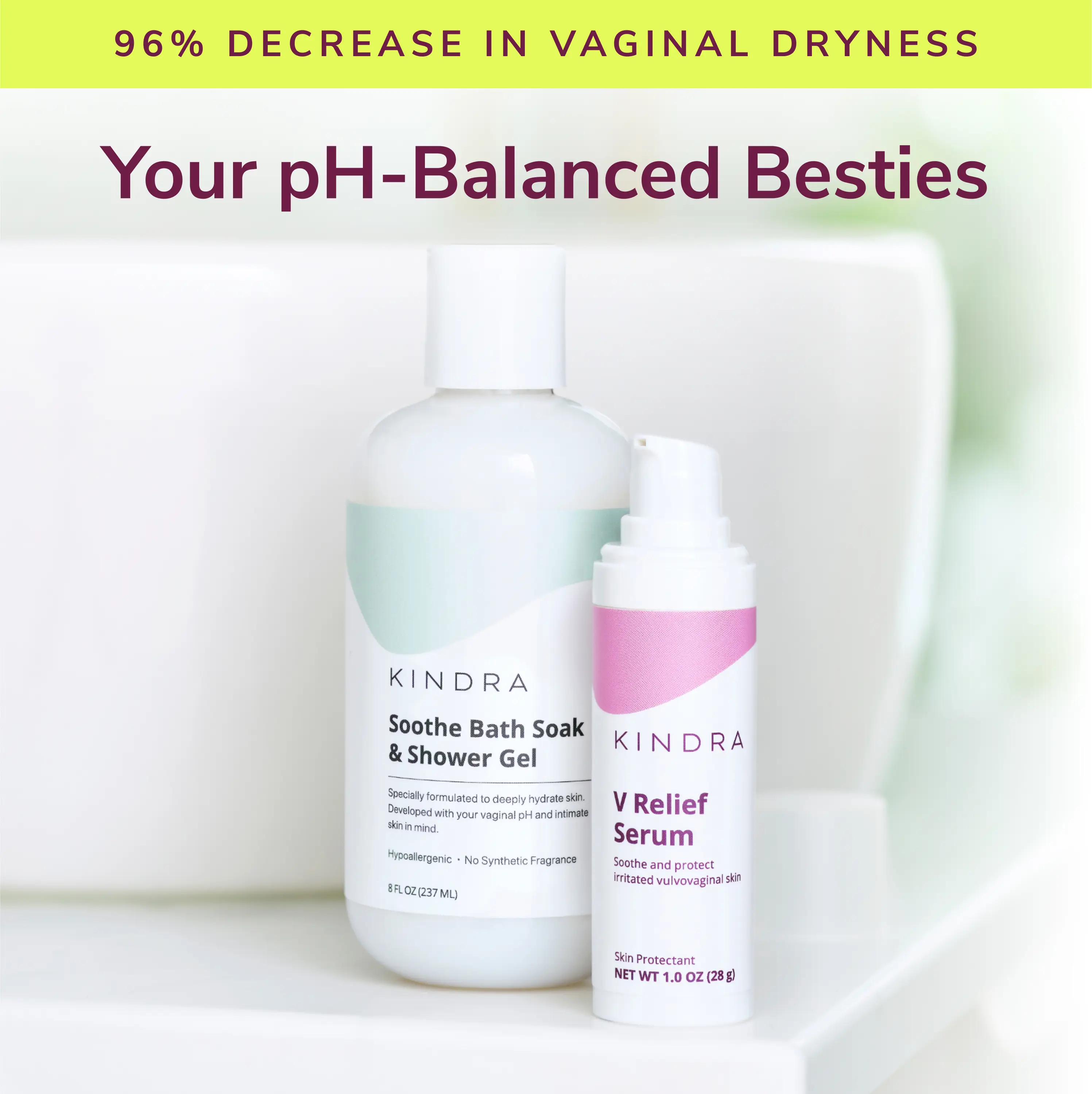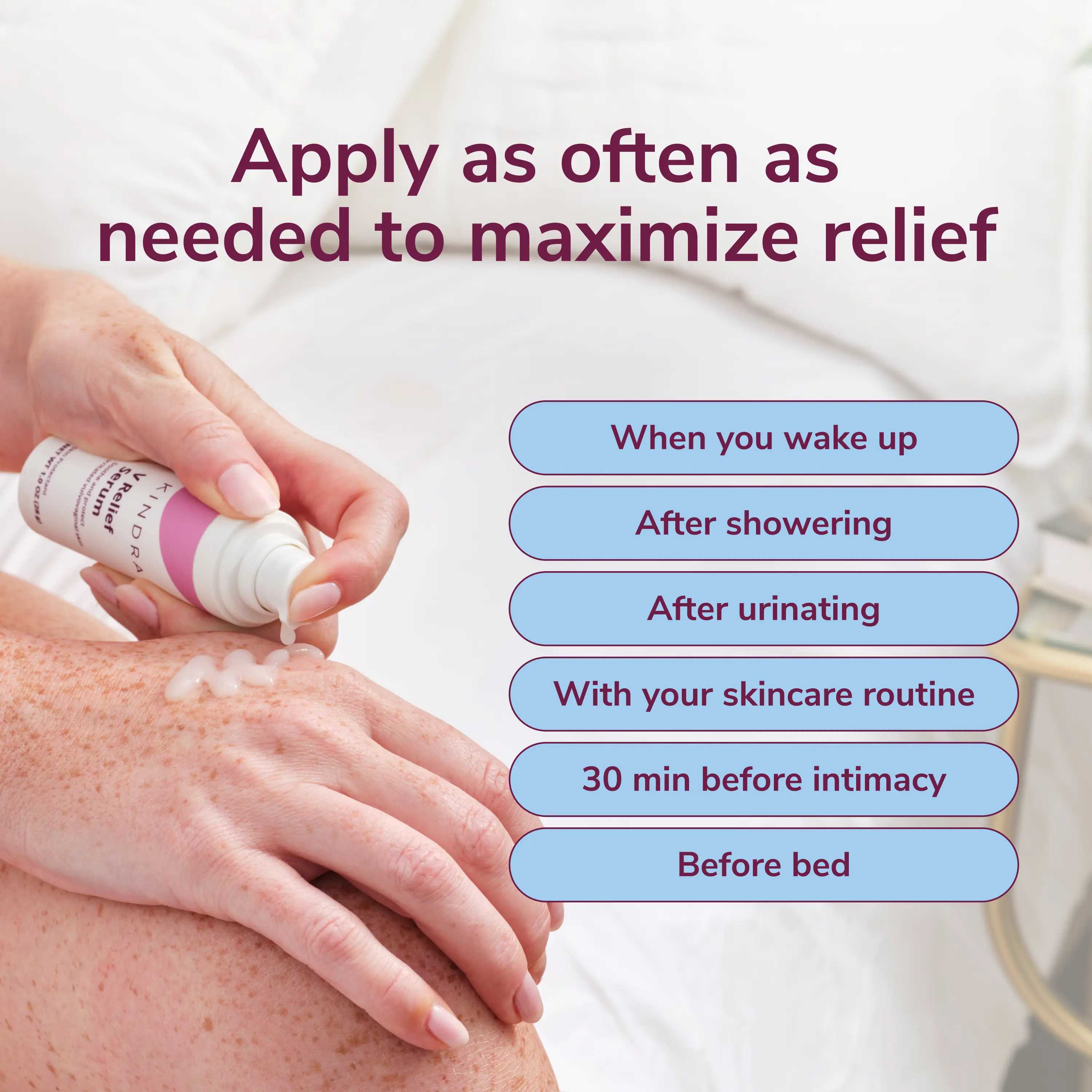 All-day comfort, every day: Use the V Relief Serum anytime dryness or irritation strikes—after the shower, workout intimacy, or AM/PM. It's lightweight gel texture absorbs quickly into the skin with no mess! Then, let Soothe pamper you in the bath or shower for hydrated, happy skin all over.