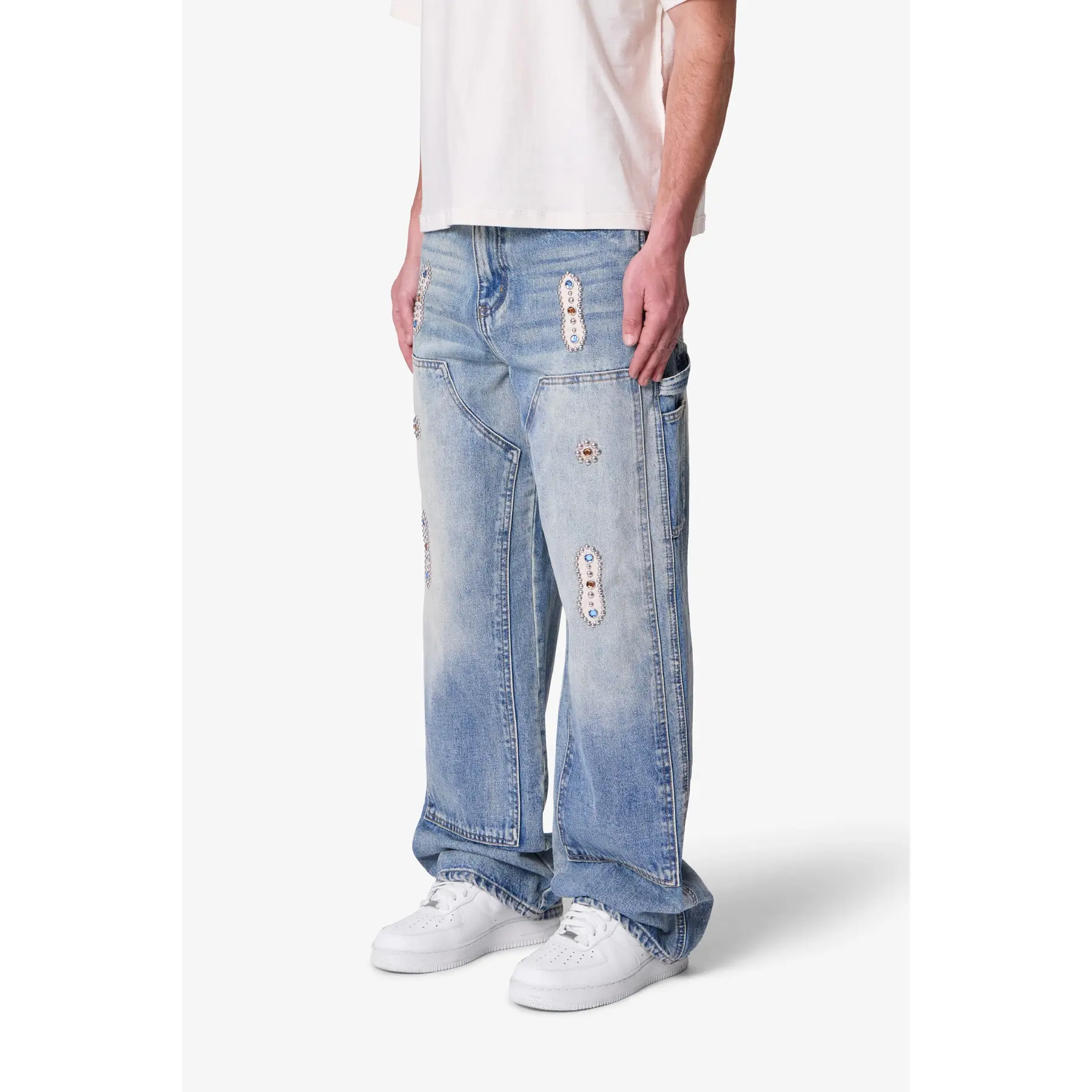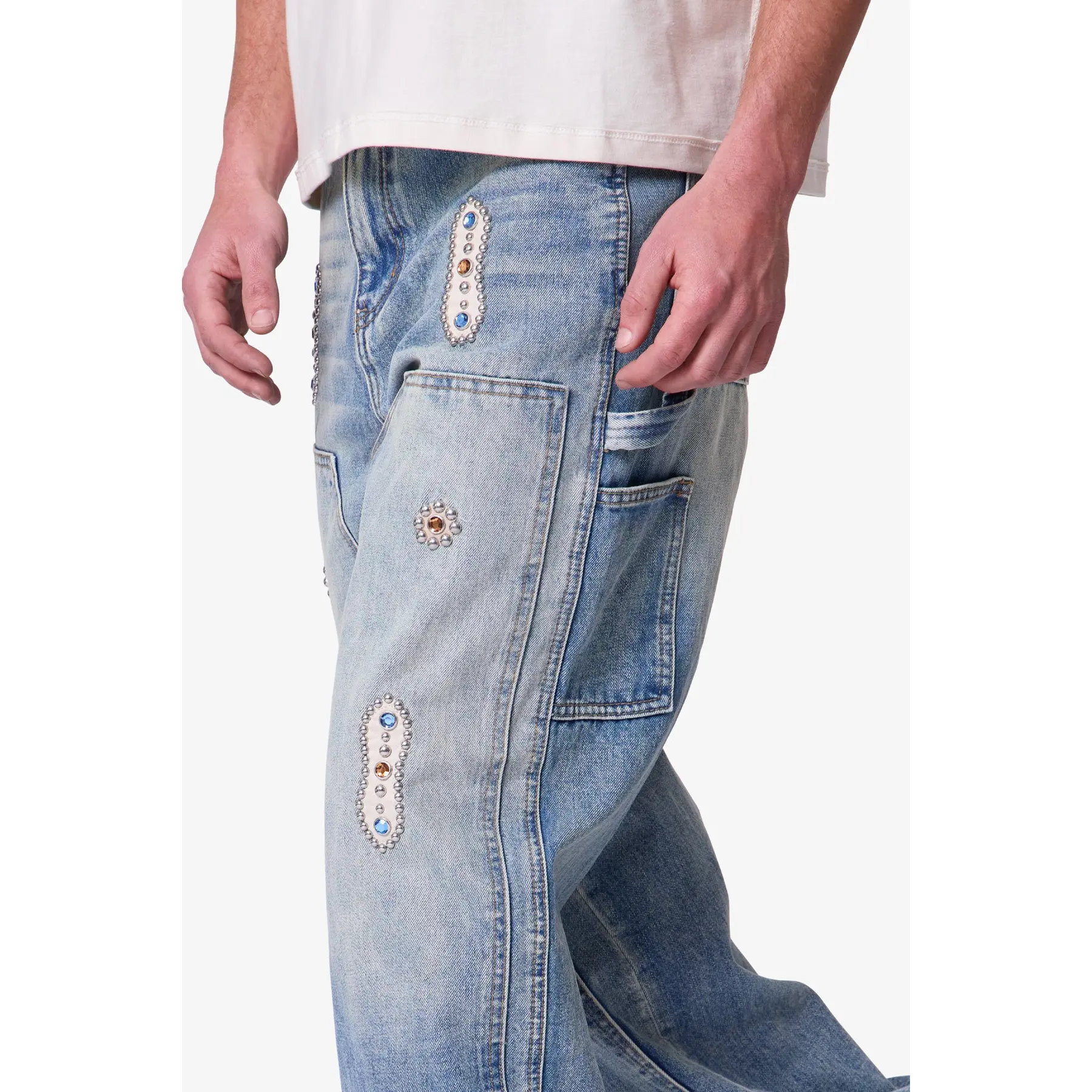 The V734 Western Jewel Denim is constructed from 100% cotton denim in a medium blue wash. Designed with a baggy fit, it features jewel and leather patch applique, a studded applique patch, and double knee construction. Functional workwear details include a hammer loop and work pocket.