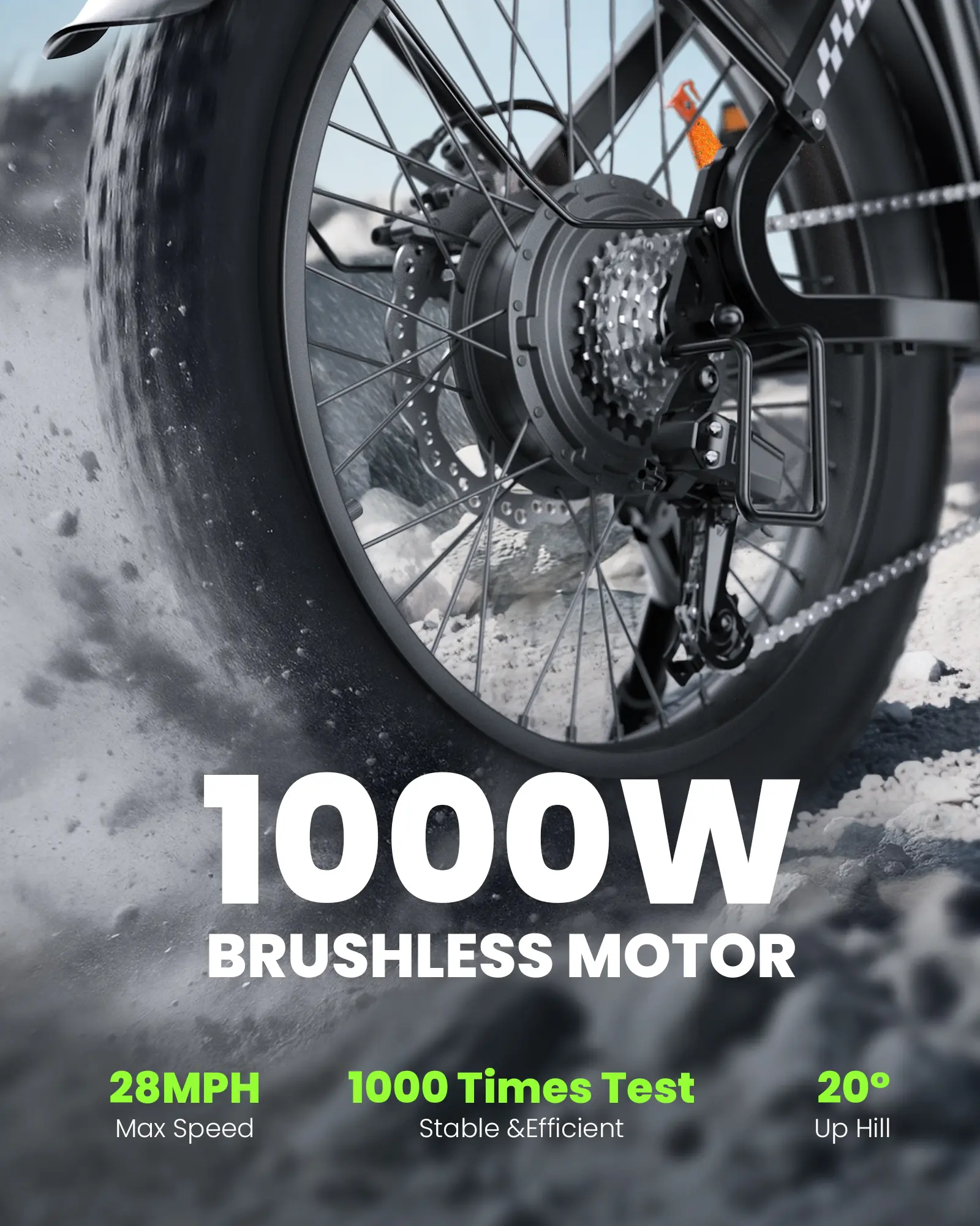 ·All-Terrain Dominator-U8 electric bicycle features 20"x3.0" 3-layer puncture-proof fat tires (5,000mi tested). Full suspension, 7-speed, 2,000lm lights & dual discs conquer any terrain.