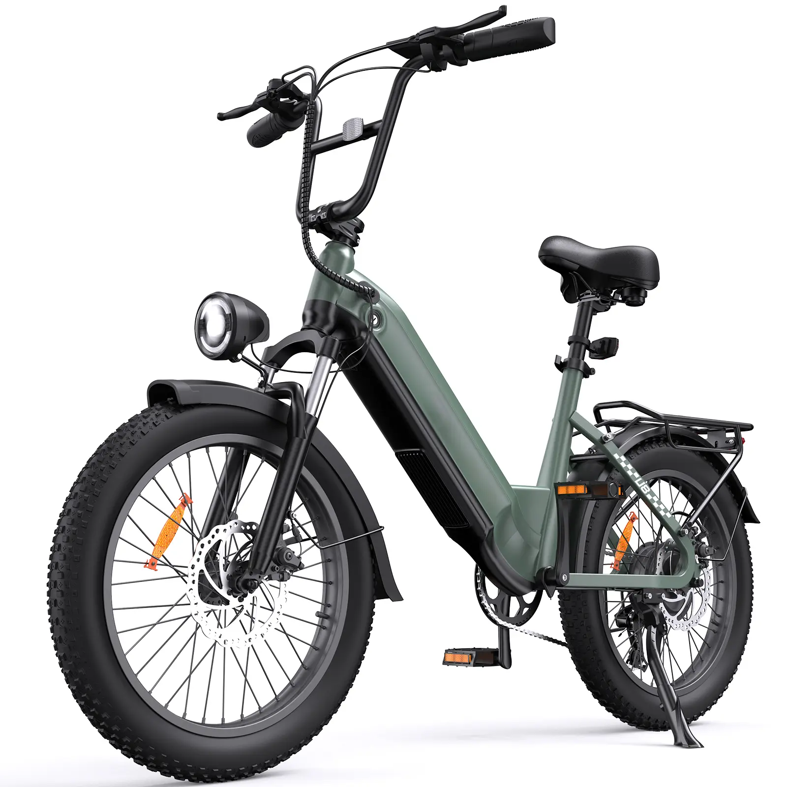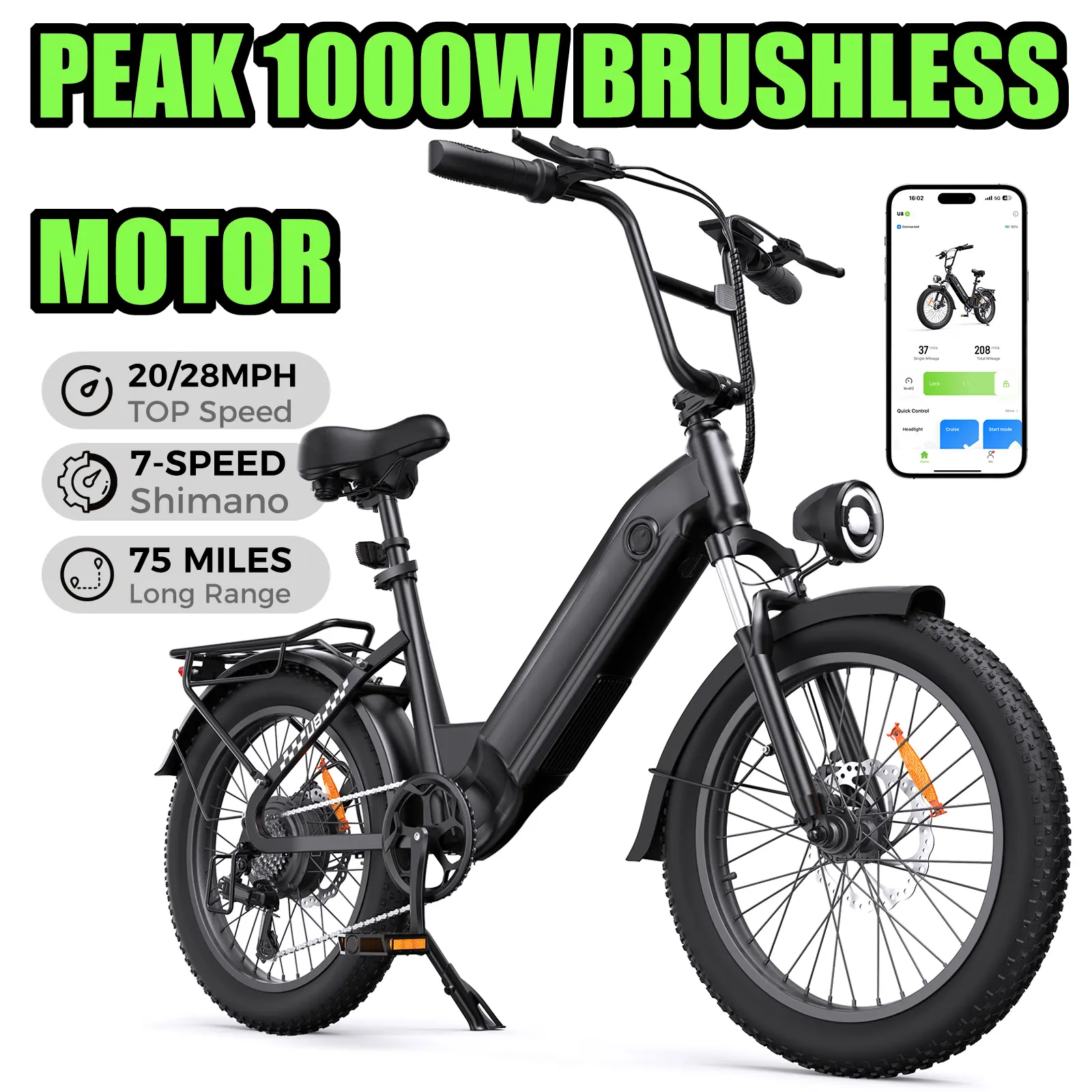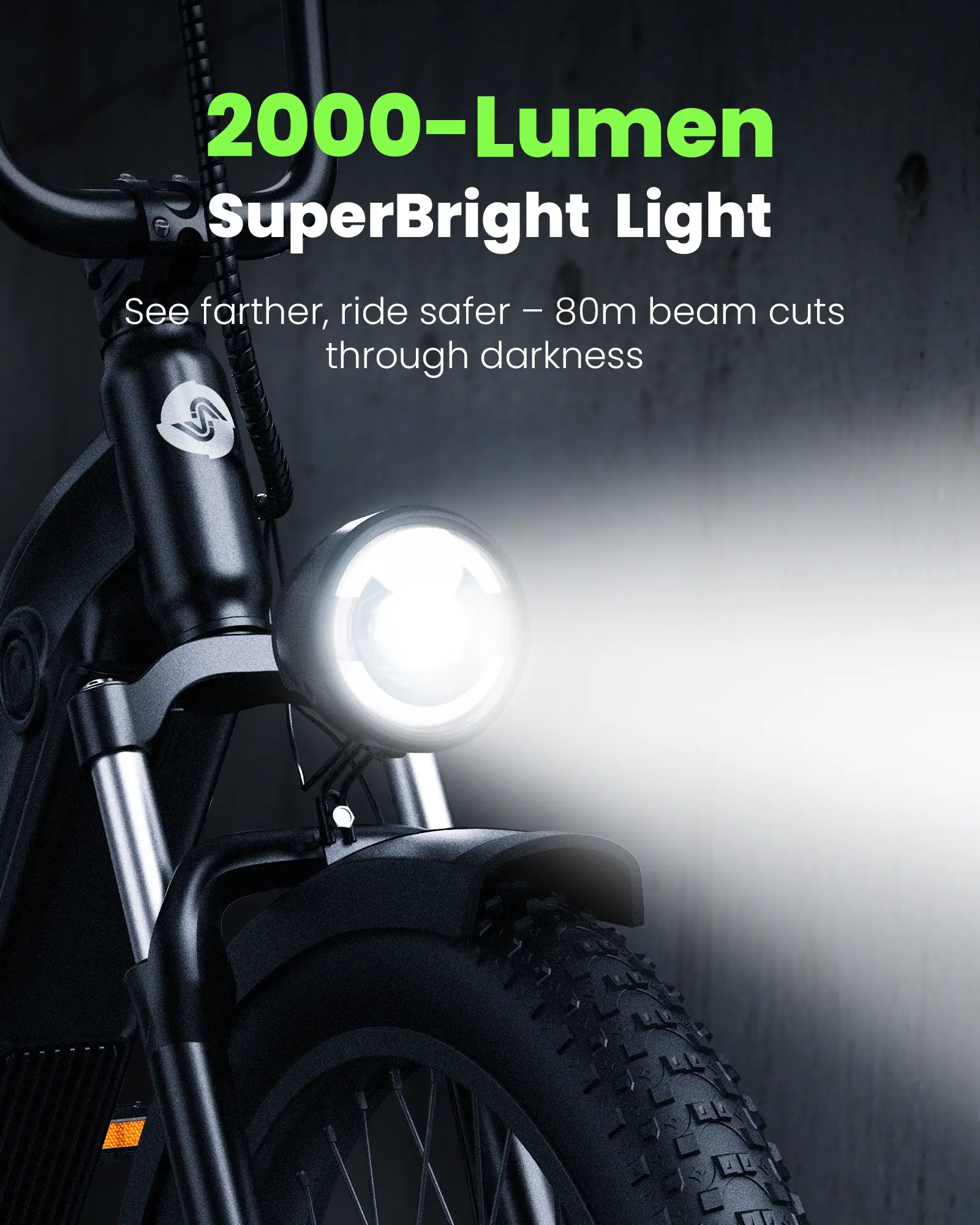 ·Smarter & Safer Riding –with 4+1 smart modes (PAS/Electric/Cruise/Walk/Pedal) and a powerful 2000-lumen light—IPX6 waterproof, U8 fat tire electric bike delivers an 80m beam with 5m-wide illumination for all-terrain visibility.