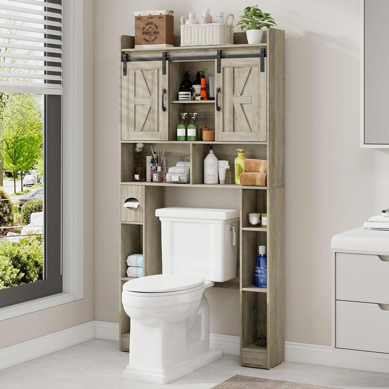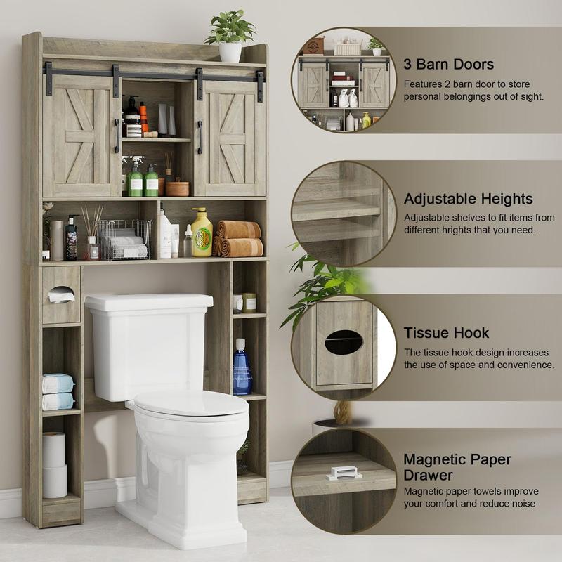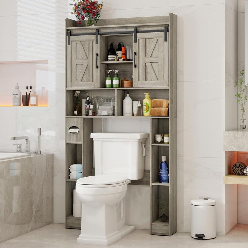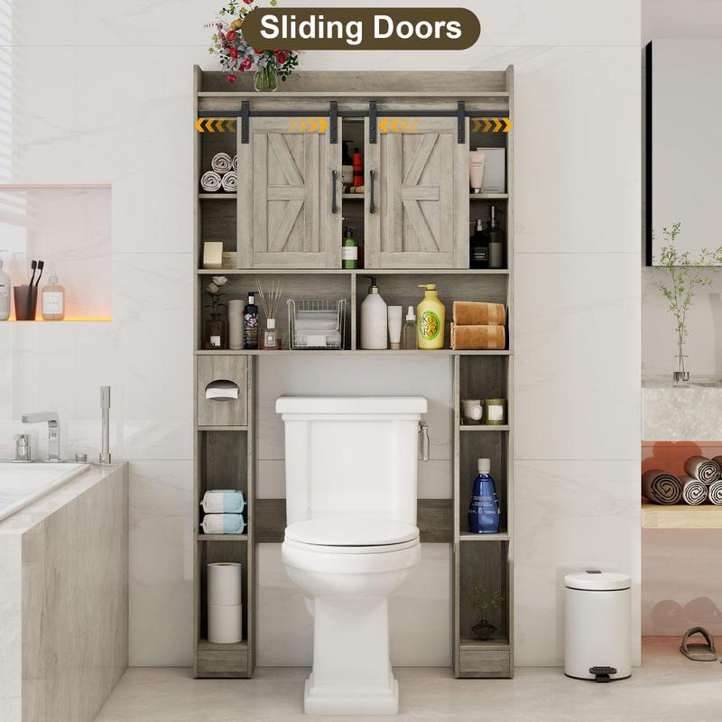 [Versatile Storage Options]The cabinet features two sliding barn doors for discreet storage of towels and toilet paper, keeping essentials hidden yet easily accessible. Open shelves provide quick access to daily items, while vertical cabinets are perfect for storing paper rolls. This versatile design meets all your bathroom storage needs in an organized and stylish manner.